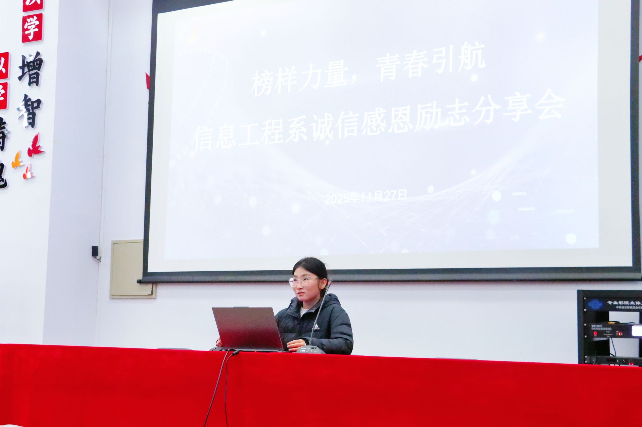 近日,信息工程系举办诚信感恩励志分享会,邀请两位优秀学生代表分享成长故事。