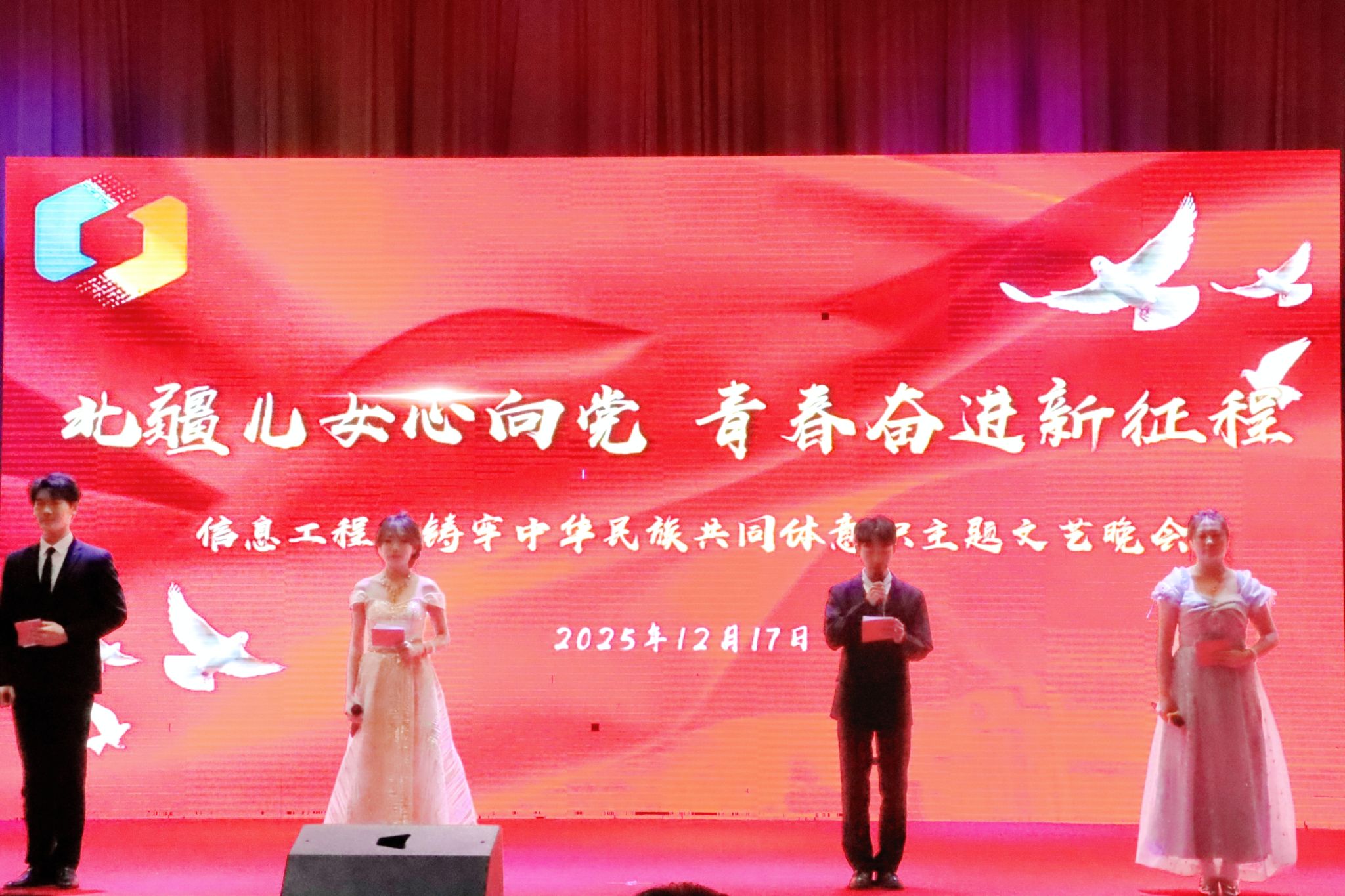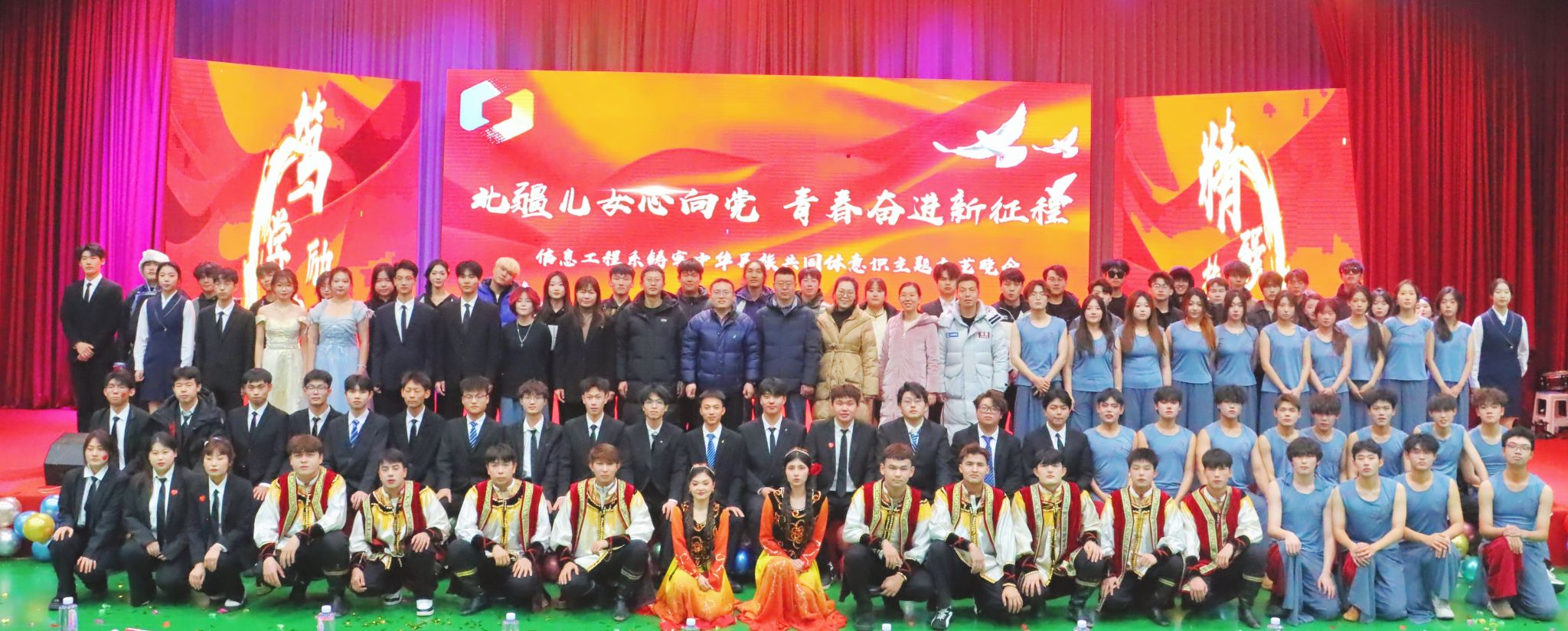 12月17日,信息工程系隆重举办“北疆儿女心向党,青春奋进新征程”铸牢中华民族共同体意识主题文艺晚会。晚会上各民族学子以歌传情、以舞明志,生动诠释着“中华民族一家亲”的深厚内涵,展现了新时代青年同心筑梦、携手前行的精神风貌。