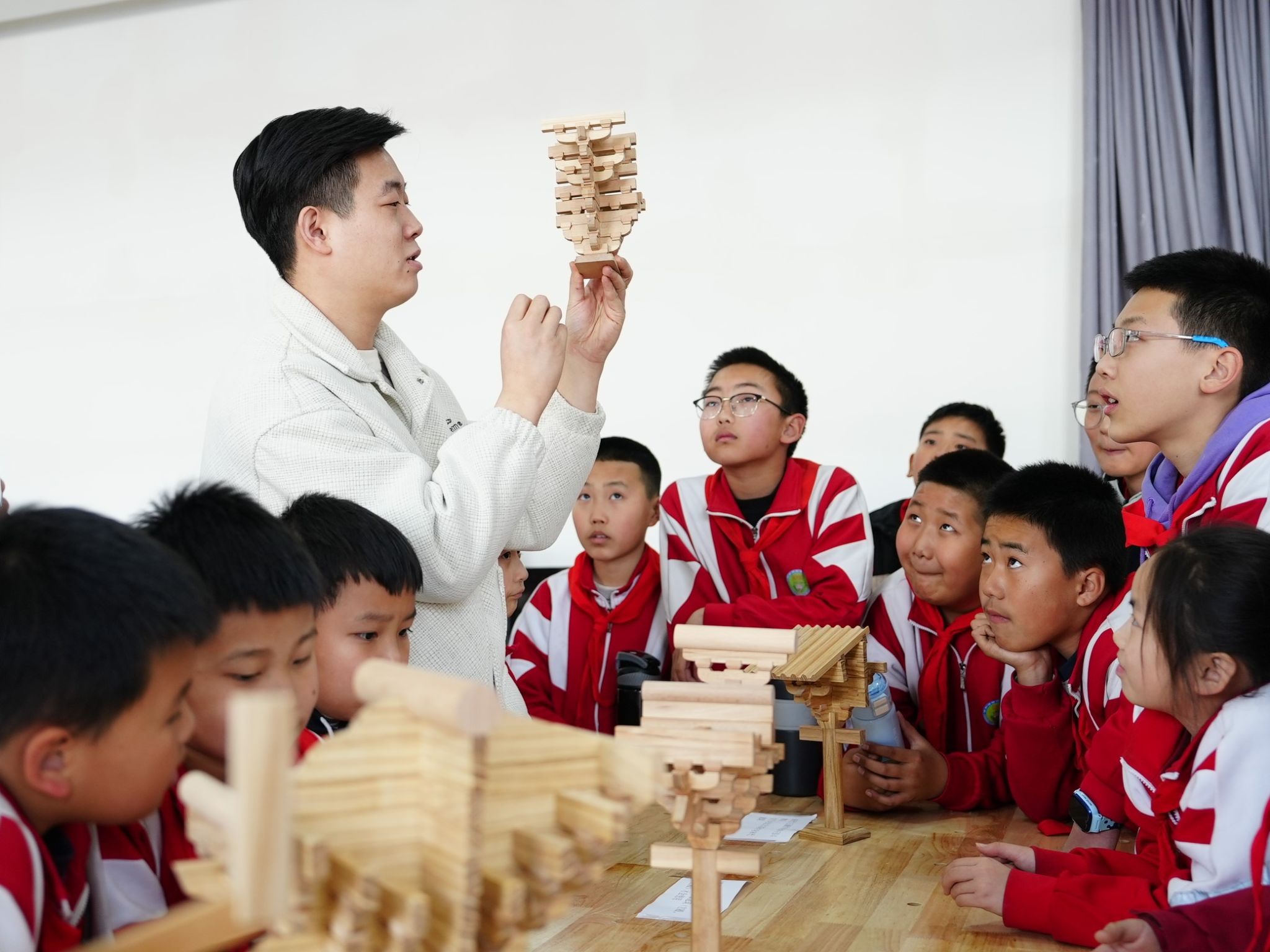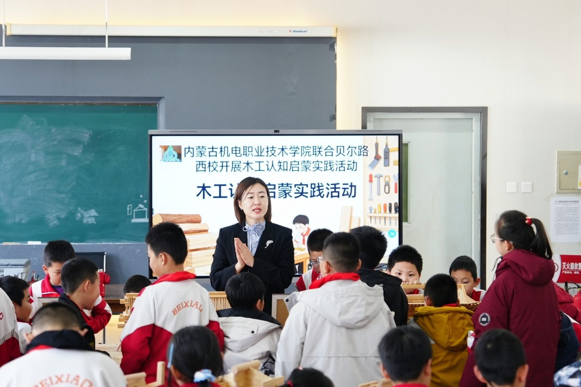 活动中,系副主任马晓宇围绕建筑文化与木工技艺进行生动讲解,带领孩子们认识天坛、故宫等代表性传统建筑,系统解析不同朝代斗拱的结构形态与功能特点,引导孩子们感受传统建筑的匠心巧思与独特美感。同时,详细介绍木工工具的名称、用途及正确使用方法,结合木结构制作场景讲解施工要点,并重点强调安全操作规范,帮助孩子们树立安全意识。