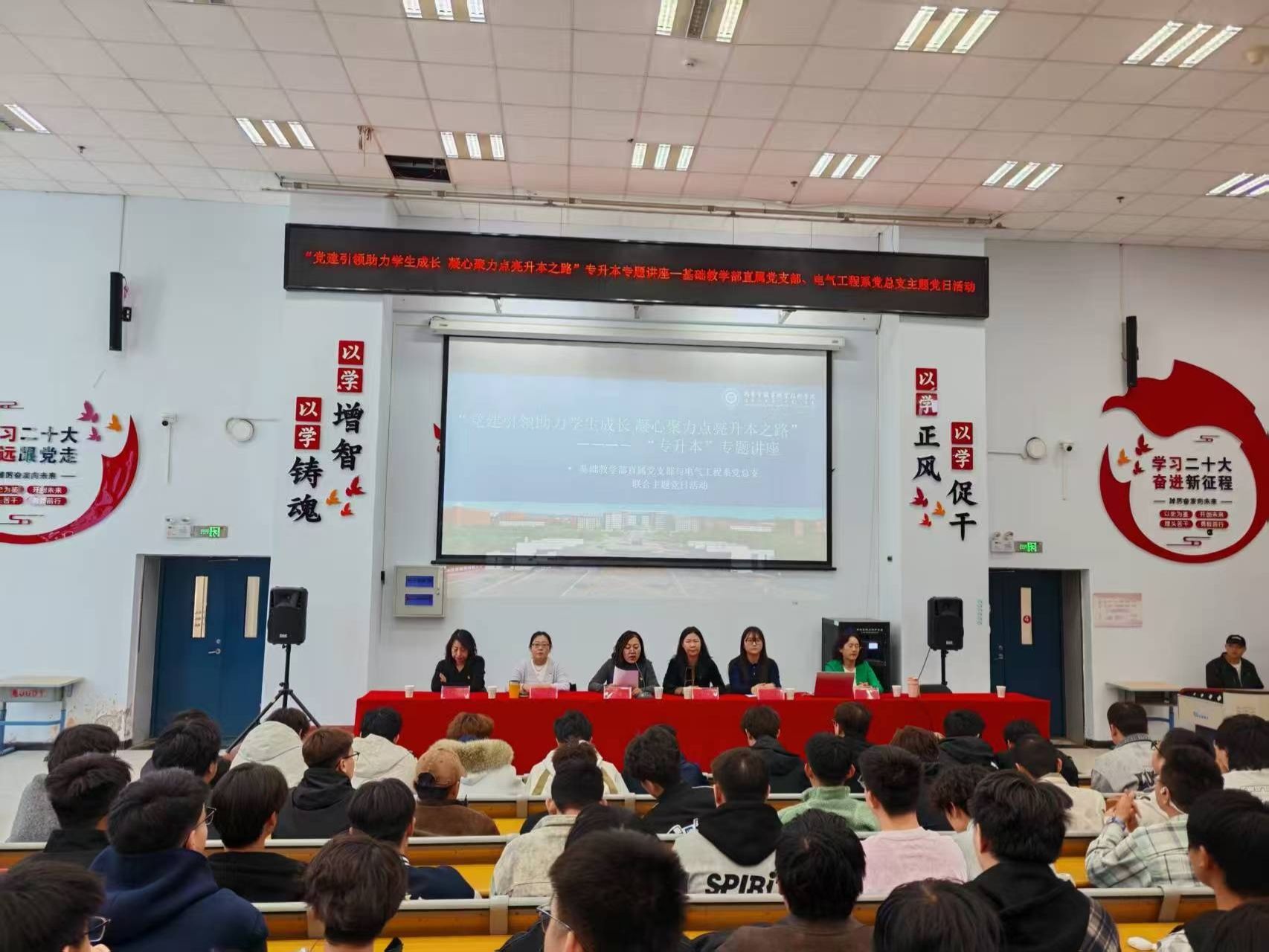 3月30日,基础教学部直属党支部联合电气工程系党总支在D区109教室开展“党建引领助力学生成长 凝心聚力点亮升本之路”主题党日活动暨专升本专题讲座。基础教学部直属党支部书记吴莅芳、电气工程系党总支书记鲁珊珊及350余名师生代表参加。