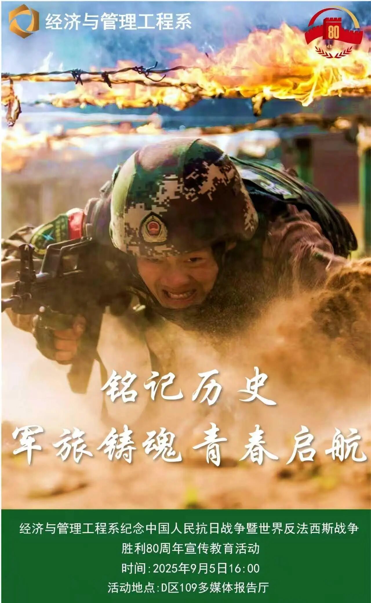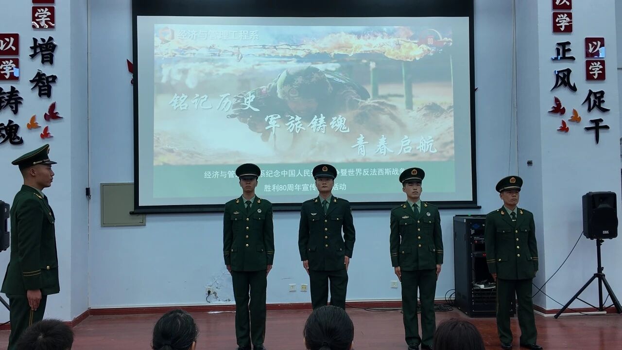 9月5日下午4:00,经济与管理工程系隆重举办纪念中国人民抗日战争暨世界反法西斯战争胜利80周年宣传教育活动——“铭记历史 军旅铸魂 青春启航”2025级新生军训动员大会,大会特别邀请了系部5名退伍复学学生,他们结合自身经历,为新生们带来了一场别开生面的分享会。经济与管理工程系党总支副书记寇莹、新生辅导员以及全体大一新生参加了本次动员大会。