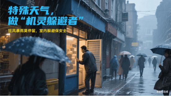 恶劣天气少出门。遇雷雨别在空旷地停留,远离树木铁塔,尽快进屋关电器。积水里走路要当心,防触电、掉井盖。突遇暴雨往高处跑,远离低洼地、电线杆和广告牌。
