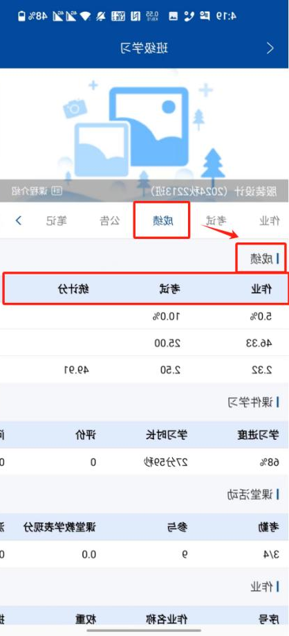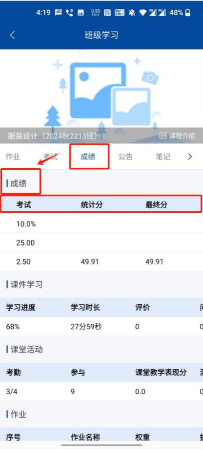 名称中包含,课件学习、课堂教学、作业、考试、统计分、最终分。权重占比、实际分、比例分,这些可在每个对应的名称下查看具体数值。(需要注意成绩是由老师端进行生成后,学生端分数才会有变化)