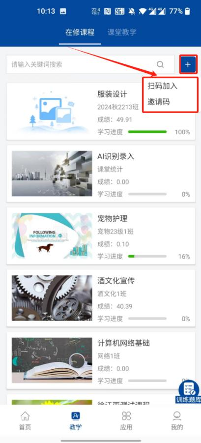 【教学】——【在修课程】里面点击右上角【+】,可选择扫码加入和邀请码两种形式进行加班。