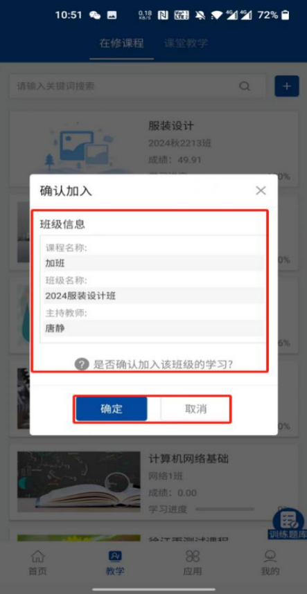 点击扫码加入、可直接对准老师班级二维码进行扫码。扫码成功后会出现对应的班 级信息。可点击【确认】或【取消】。点击【确认】后会提示申请加入成功,且在修课程会显示已经加入的课程。