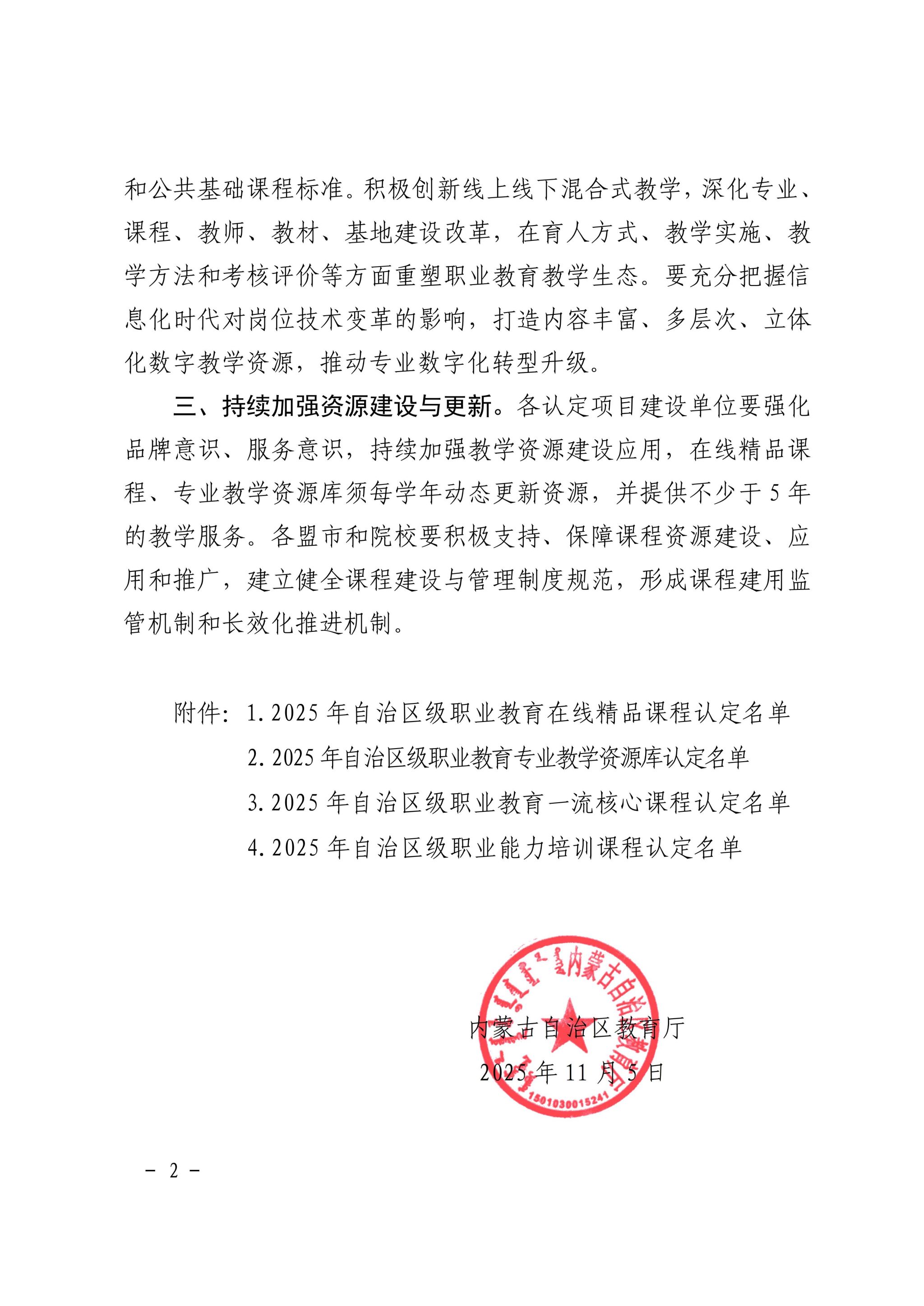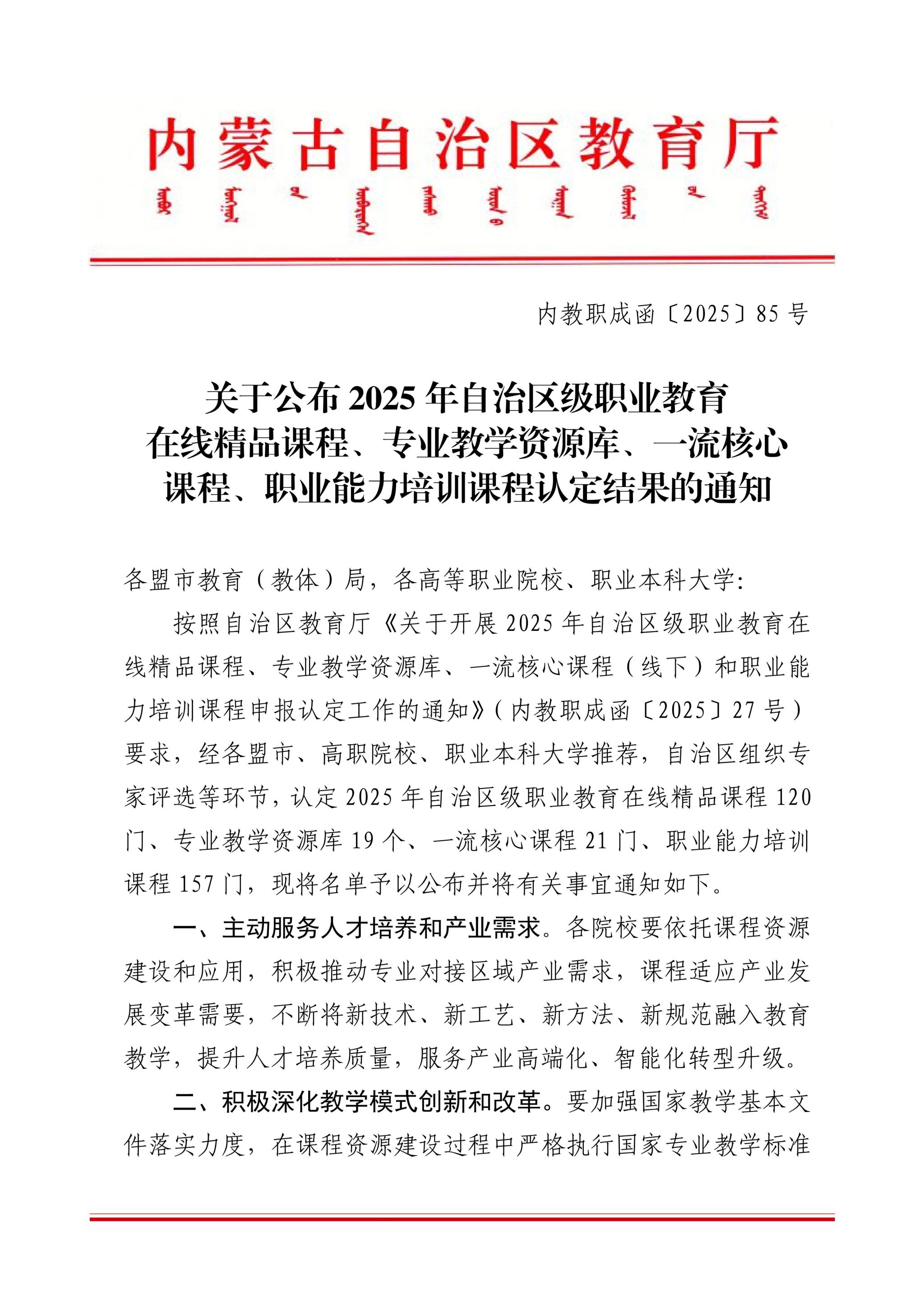 关于公布2025年自治区级职业教育在线精品课程、专业教学资源库、一流核心课程、职业能力培训课程认定结果的通知