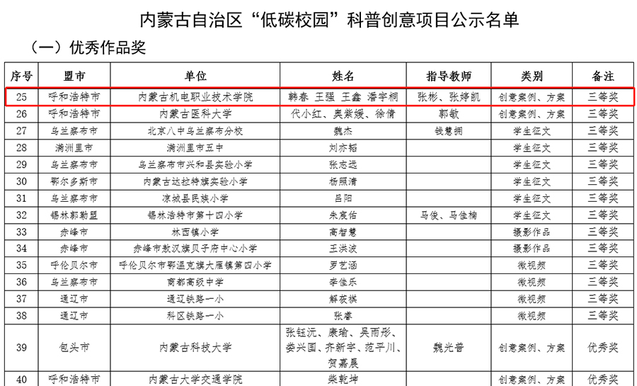 近日,内蒙古自治区教育厅印发了《关于公布内蒙古自治区“低碳校园”科普创意项目获奖名单的通知》(内教科信函[2023]50号),经过个人申报、单位推荐、形式审查及专家评选、网上公示,我院4件创意案例作品分别荣获三等奖1项、优秀奖3项。