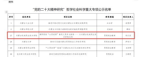 近日,内蒙古自治区教育厅公示了“党的二十大精神研究”哲学社会科学重大专项评审结果。马克思主义教研部主任郑云宏教授带领青年教师申报“高职院校‘大思政课’善用之思考与探索——以内蒙古机电职业技术学院为例”,获批“党的二十大精神研究”哲学社会科学重大专项项目立项,完成了马克思主义教研部此类立项的再次突破。