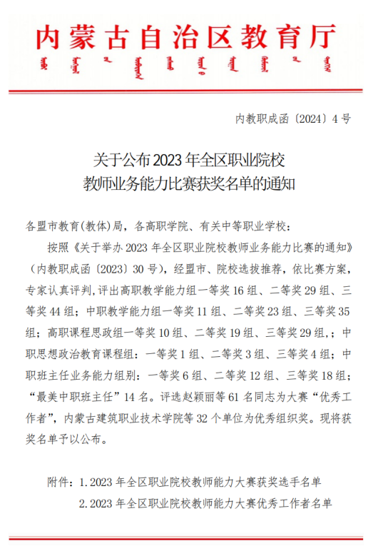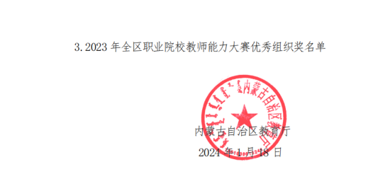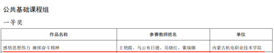 近日,内蒙古自治区教育厅公布了2023年全区职业院校教师业务能力比赛获奖名单,由马克思主义学院教师王艳霞、乌云布日德、吴晓红、董瑞娜组成的教学团队在公共基础课程组中荣获一等奖的好成绩。对我院教师取得的好成绩表示热烈祝贺!