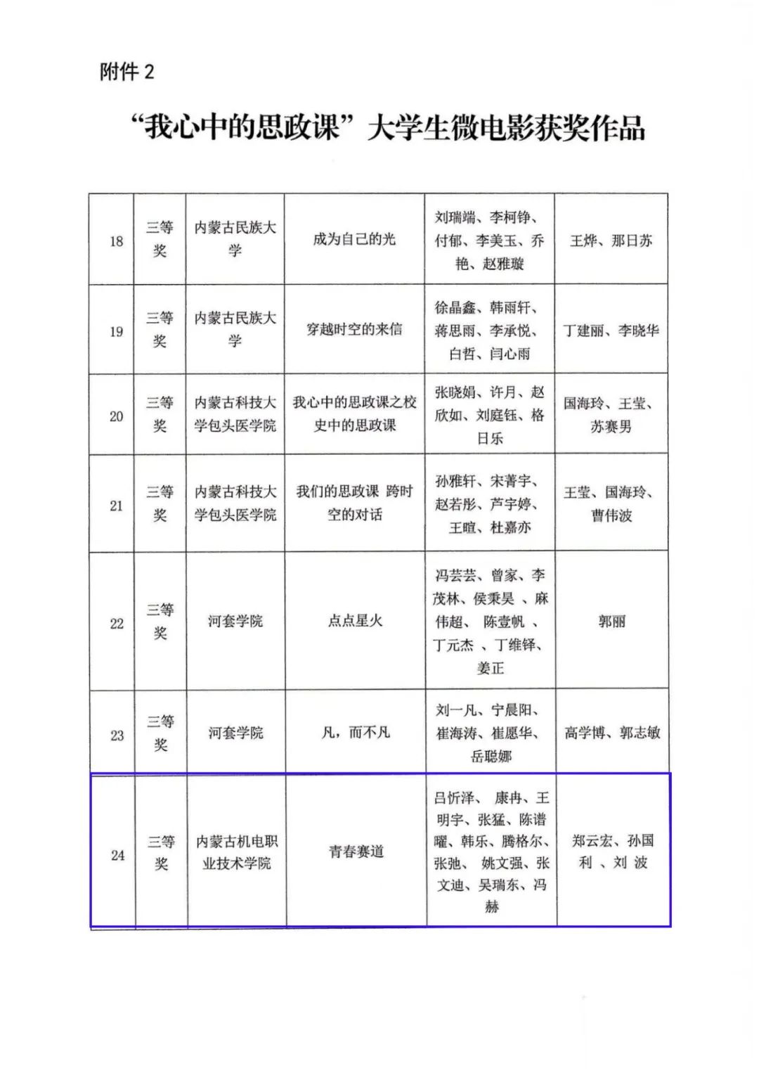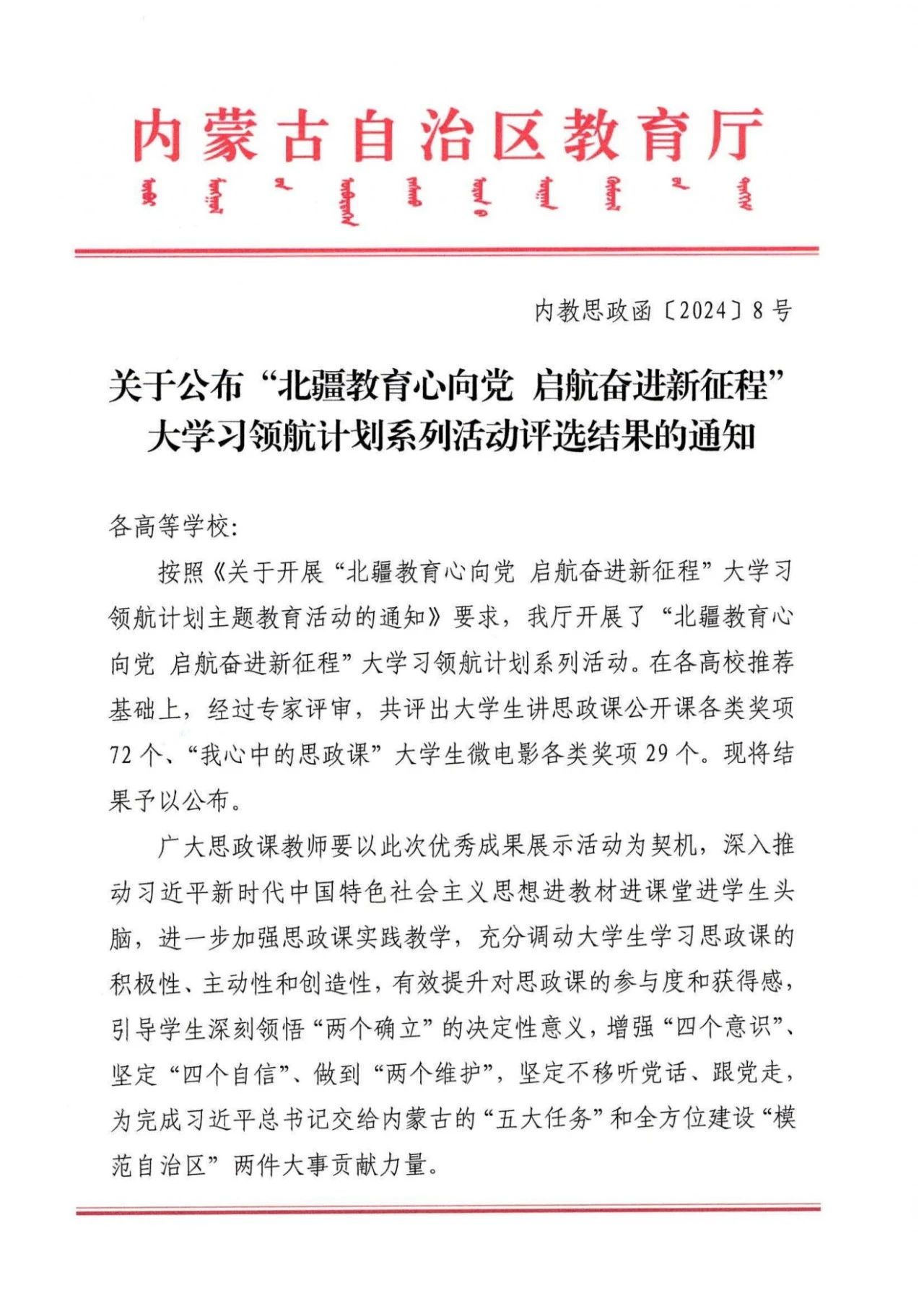 近日,内蒙古教育厅公布了“北疆教育心向党 启航奋进新征程”大学习领航计划系列活动评选结果,其中,我院报送的大学生讲思政课公开课作品《内蒙古的革命火种在这里点燃》、“我心中的思政课”大学生微电影作品《青春赛道》分获二等奖和三等奖。
