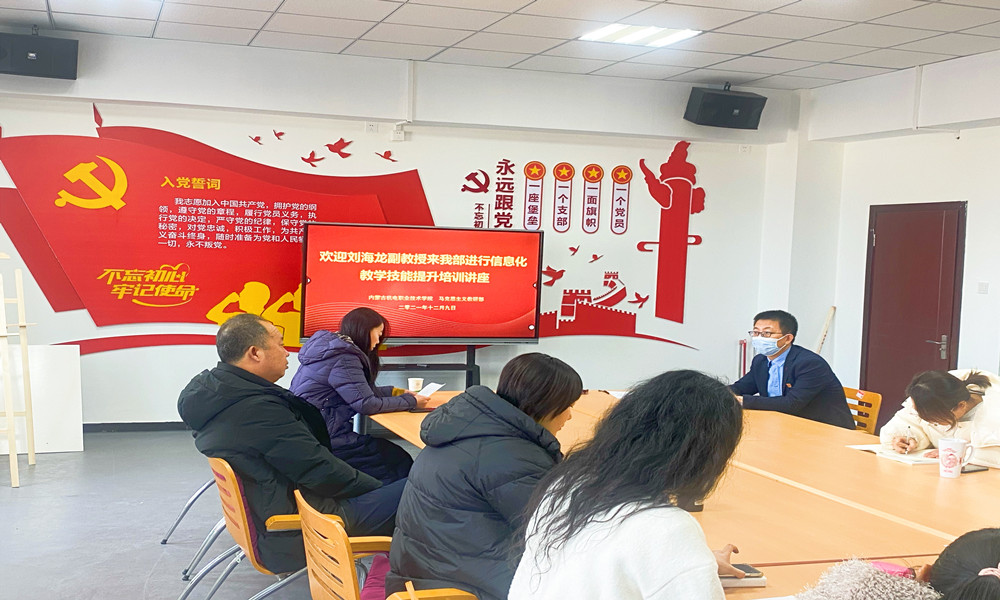 刘海龙,内蒙古化工职业学院信息工程系副主任,计算机应用技术专业专业带头人,副教授,多次获自治区及全国教师信息化技能类奖项,擅长课程思政、翻转课堂、混合式教学等内容,主持完成计算机应用技术专业自治区级教学资源库建设及多项自治区级以上教育科研课题。刘海龙教授为我部教师进行了信息化环境下教与学的策略、信息化教学技术储备、课程设计、如何备赛四个方面的培训,讲解了信息化背景下课堂授课方式的改变,分析教师授课模式的转变,学生学习方式的变化以及实施课堂教学的建议。培训后与我部教师进行了研讨交流。