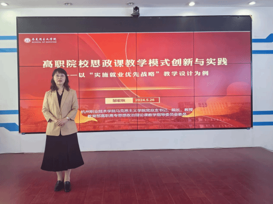 5月26日,我院邀请杭州职业技术学院马克思主义学院党总支书记、院长,教育部高等学校思想政治理论课教学指导委员会“高职高专思想政治理论课”分教学指导委员会委员邹宏秋教授为我院承办的内蒙古自治区职业院校教师素质提高计划(高职)思想政治理论课教师教学能力提升培训班授课,题目为《高职院校思政课教学模式创新与实践——以“实施就业优先战略”教学设计为例》。