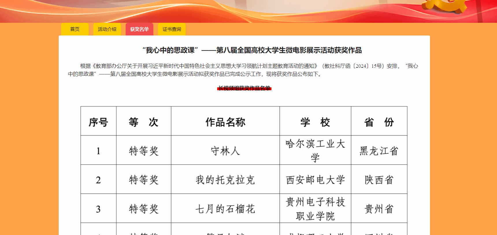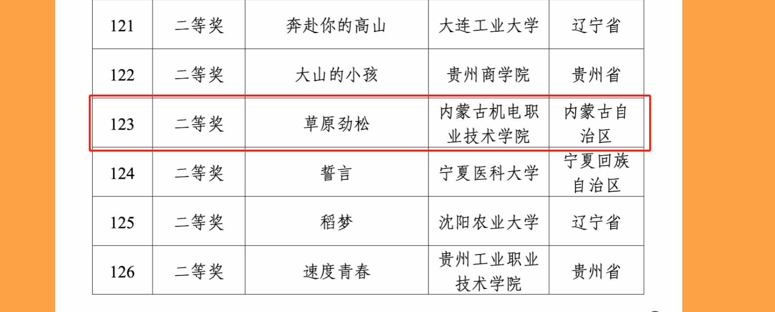 由教育部高校思想政治理论课教学指导委员会主办的“七十五载薪火传承,千秋伟业奋斗有我——第八届全国高校大学生讲思政课公开课展示活动”评审结果揭晓。全国共有1006所高校提交了3134部微电影作品,其中我校微电影《草原劲松》获长视频组全国二等奖。