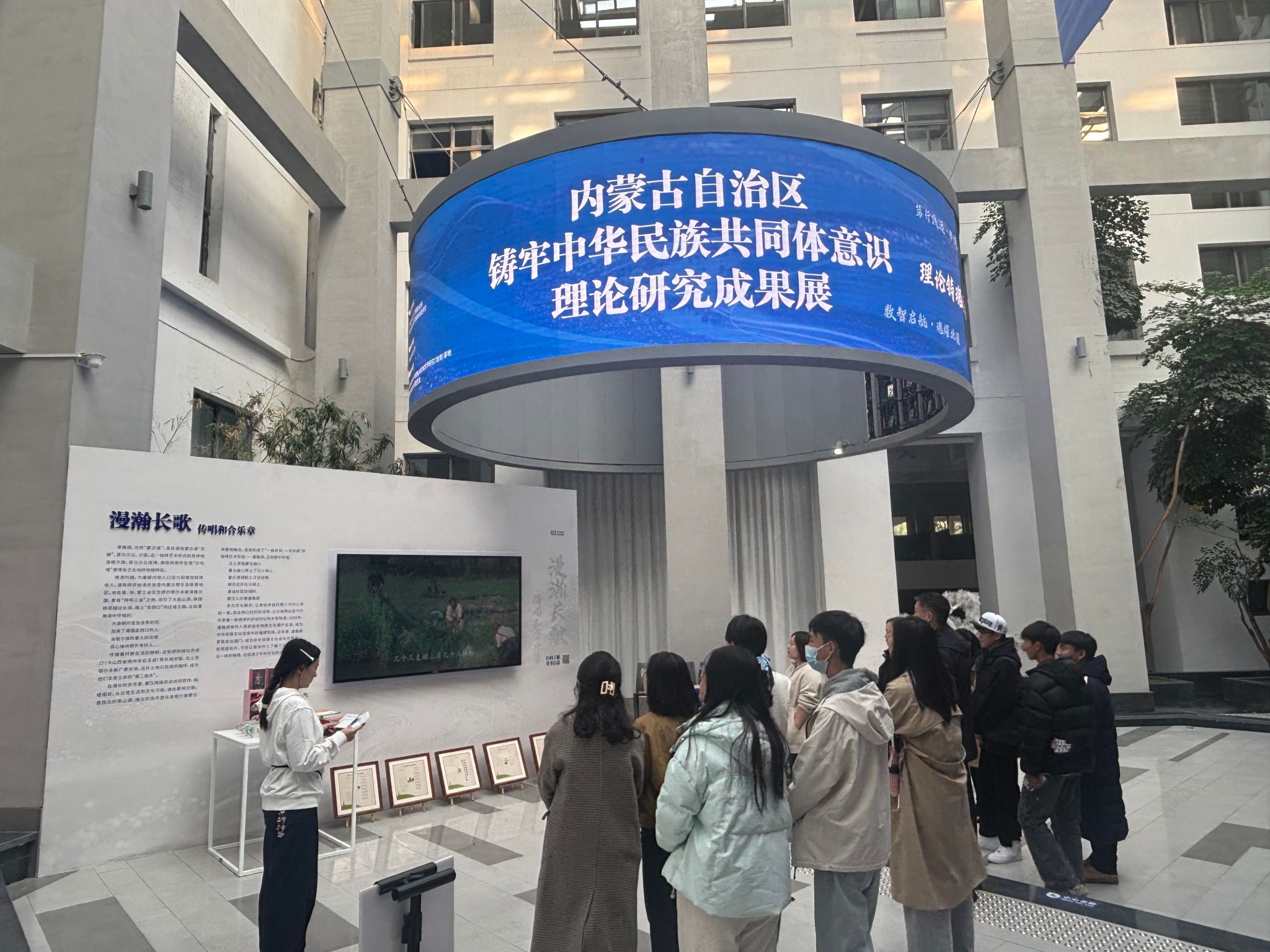 10月23日下午,马克思主义学院专任教师和部分学生共同前往内蒙古师范大学,参观了内蒙古自治区铸牢中华民族共同体意识理论研究成果展。展览由自治区党委统战部、自治区民委主办,以“理论铸魂固根脉实践赋能耀北疆”为主题,以“凝智探源、笃行践远、数智启航”为脉络,系统呈现全区在铸牢中华民族共同体意识、推进中华民族共同体建设过程中,在理论探索和实践创新方面所取得的卓越成就。