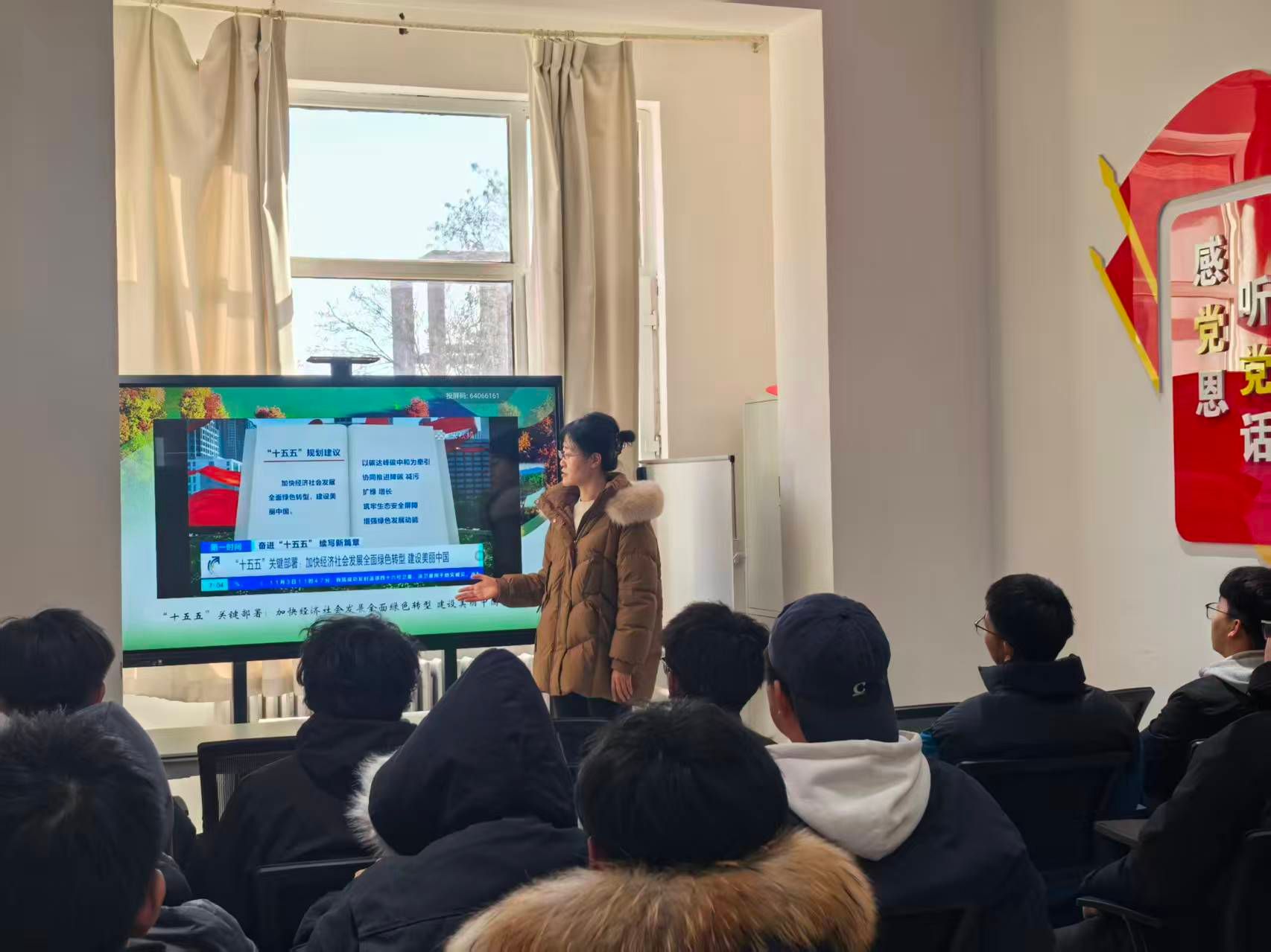 2025年11月13日,马克思主义学院教师王千月老师走进学院“一站式”学生社区,开展了《绿水青山——中国全面绿色发展之路》主题讲座。讲座中,王千月老师首先阐述了绿色发展的理论基础,指出这是实现高质量发展的必然选择,关系到人与自然和谐共生的中国式现代化建设。接着通过具体案例,展示了我国在产业结构优化、能源体系转型和生态环境治理等方面取得的显著成效,特别是在推动传统产业绿色升级和培育新兴产业方面取得重要进展。最后,重点解读了"十五五"规划关于加快经济社会发展全面绿色转型的部署,说明“十五五”期间,我国要以碳达峰碳中和为牵引,协同推进降碳、减污、扩绿、增长,为建设美丽中国注入新的发展动能。