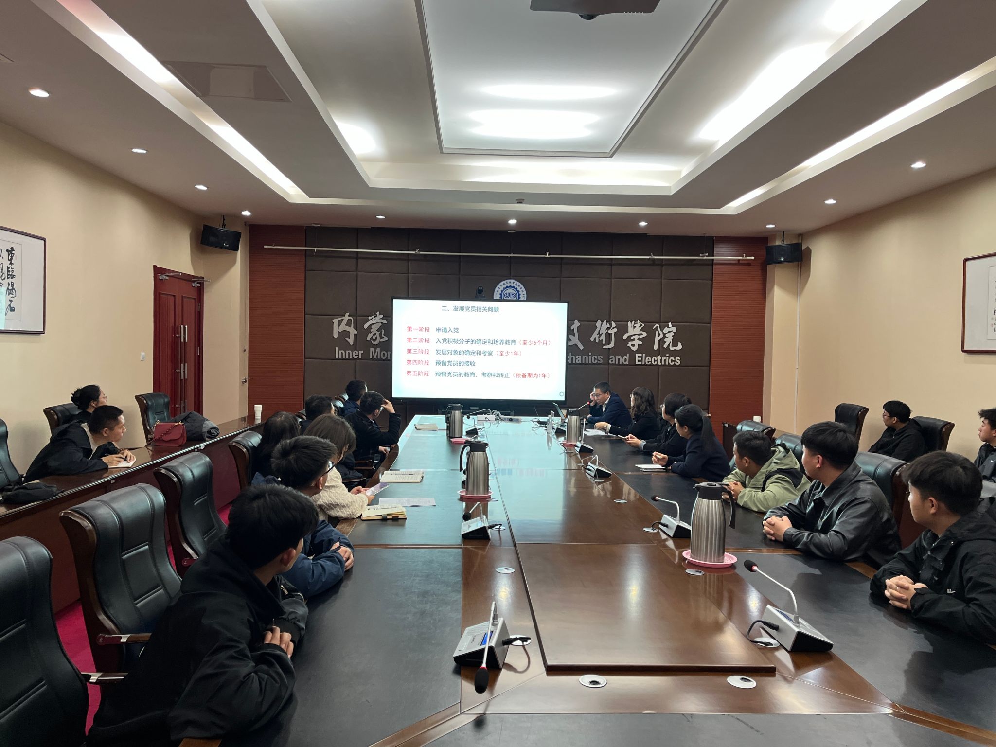 2025年11月5日下午,能源与材料工程系党总支在会议中心二楼一号会议室顺利举办了2025年党员教育培训系列活动的专题讲座。本次讲座特邀中共呼和浩特市委党校教师担任主讲。党总支班子成员、全体党员及我系2025年下班发展对象共计三十余人参加学习。