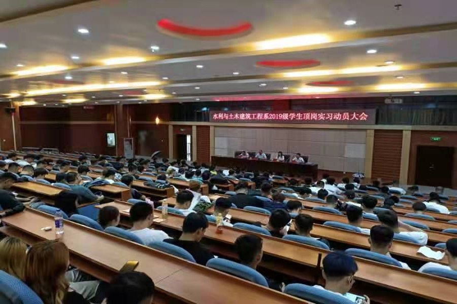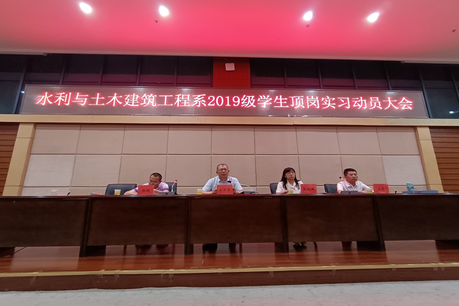 7月2日下午4:30,水利与土木建筑工程系在图书馆报告厅召开2019级学生顶岗实习动员大会,系党总支书记、主任要永在,副主任张瑞麟,副书记张雄,19级全体学生及辅导员参加会议,会议由系实训与创新中心主任、顶岗实习管理员王彦主持。