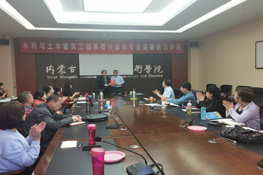 党史学习教育开展以来,我系积极开展“我为群众办实事”实践活动,聚焦师生“急难愁盼”问题,把党史学习教育成果转化成为民办实事、解难事的实际行动,切实增强师生的获得感、幸福感和安全感。为了提升我系全体教师的专业实践能力,2021年5月27日下午15:00,系党总支邀请内蒙古建筑协会副会长、土建类专业群带头人翟慧泉在会议中心二楼一号会议室举办了“提升教师专业实践能力”讲座。本次讲座由系党总支书记、系主任要永在主持,系部全体教师参加了此次讲座。学院党委委员副院长郝俊在讲座前为翟慧泉同志颁发了土建类专业带头人聘书,并就水利系教师实践能力提升的重要性和今后所开展的工作做了重要指示。
