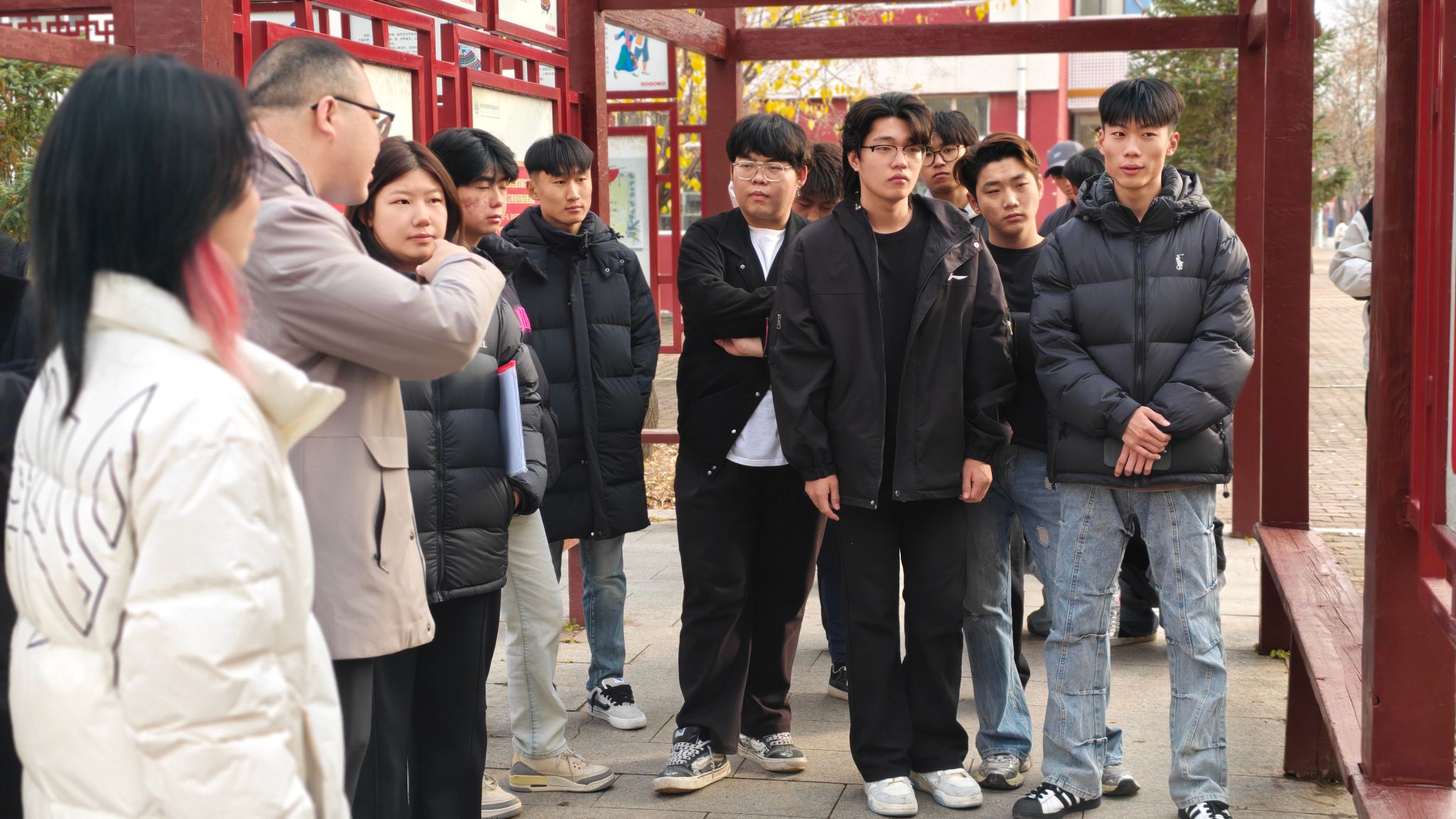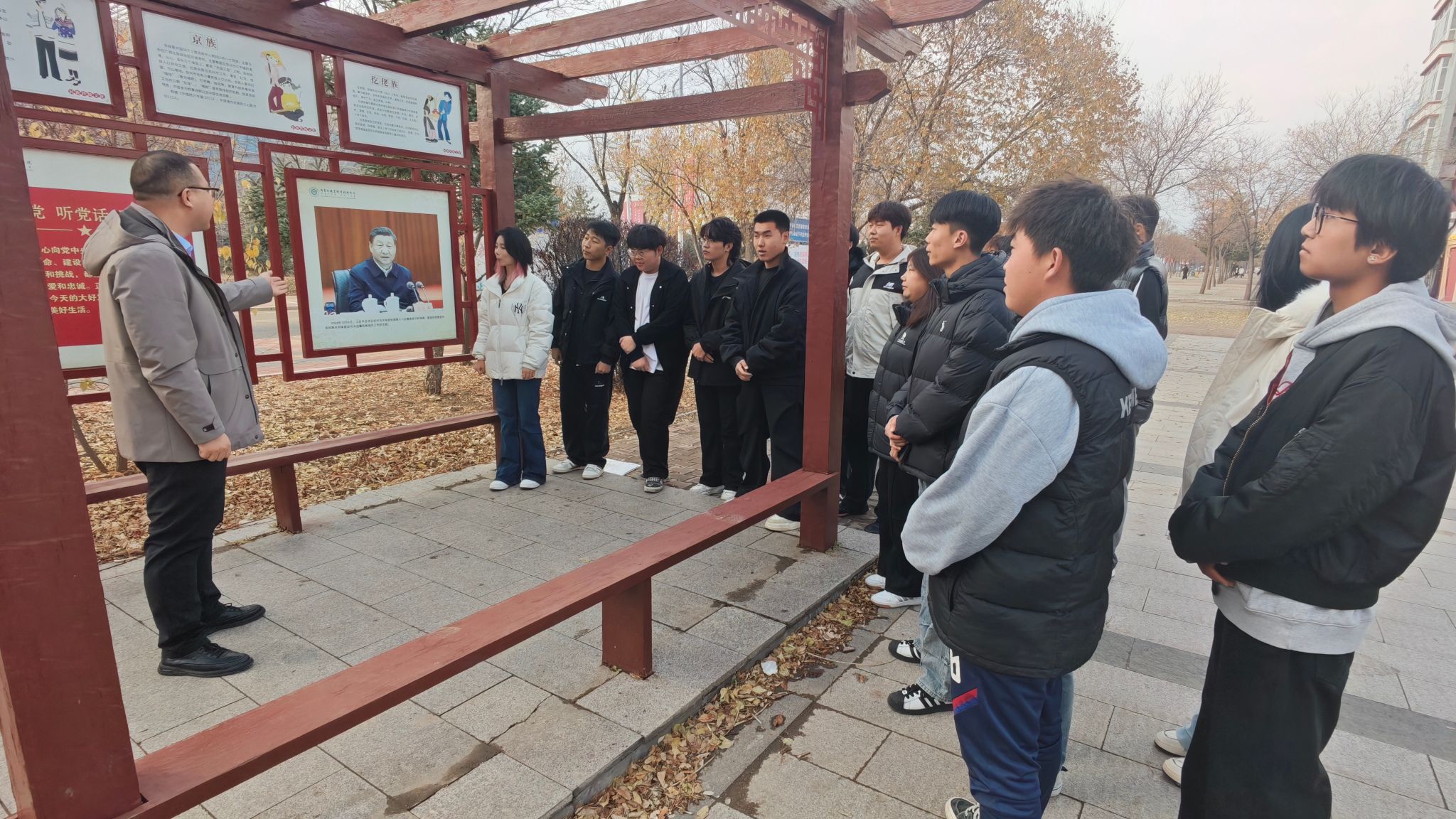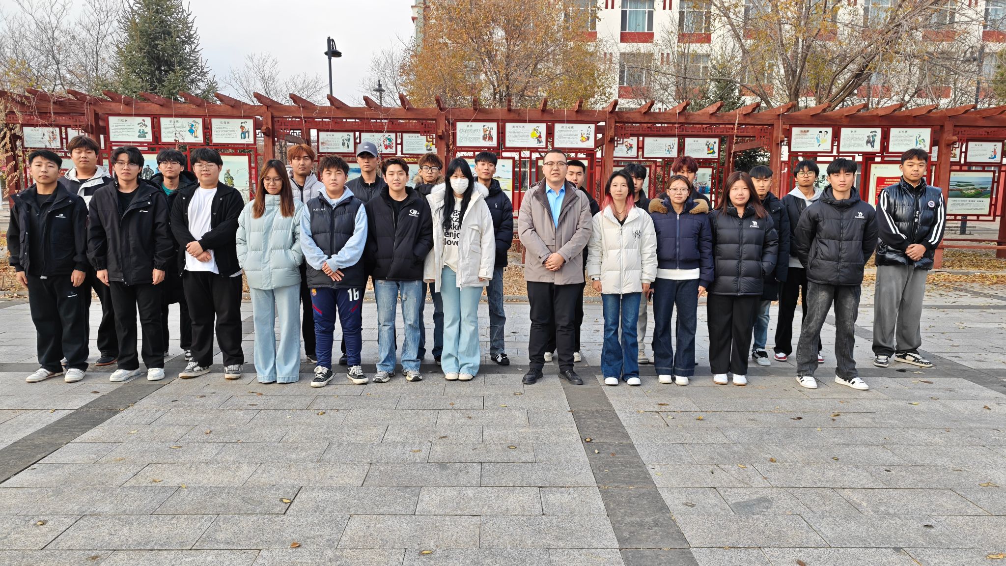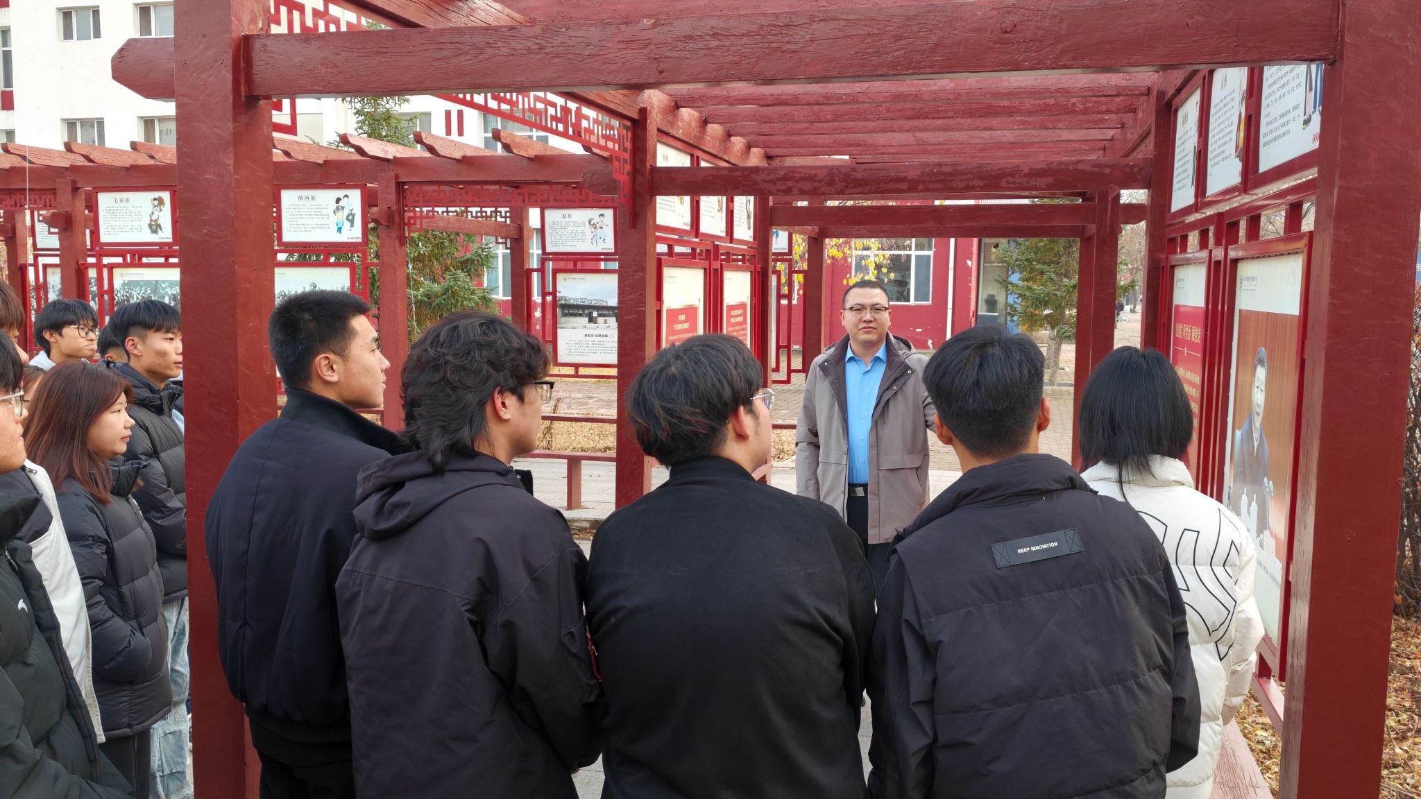 活动当天,在池晓龙老师的带领下,40余名学生代表走进这条以"铸牢中华民族共同体意识"为主题的文化长廊。长廊通过图文展板等形式,系统呈现了"内蒙古地区是党最早领导建立的民族自治区"等六句话的深刻内涵,生动展现了中国共产党领导下内蒙古民族团结进步的光辉历程。