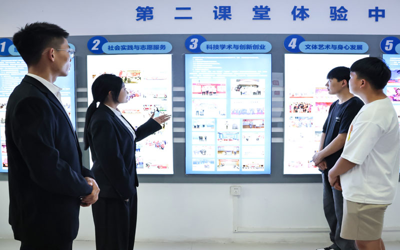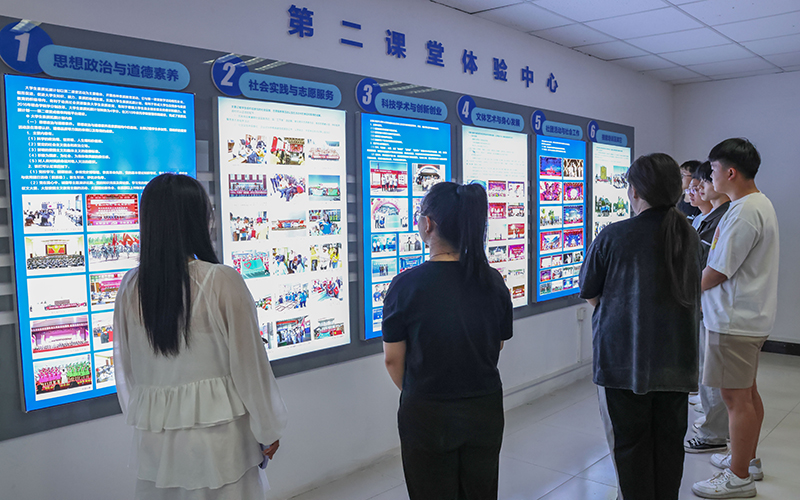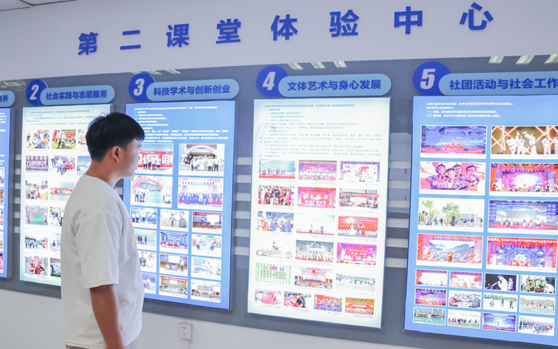 第二课堂体验中心以帮助学生了解第二课堂创造更好的体验环境为出发点,集参观性、互动性、学习性为一体,通过现场讲解、互动交流等方式,帮助学生全程化掌握第二课堂的参与方式,助力学生全面成长成才。