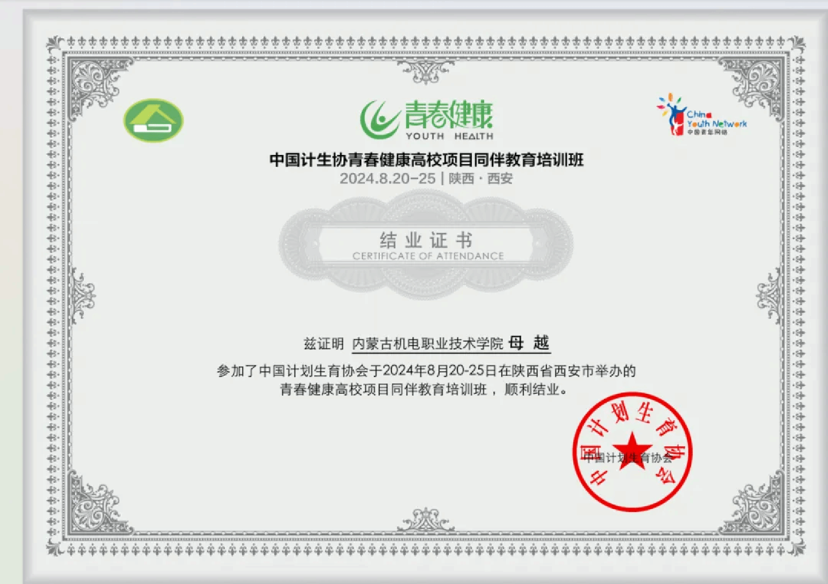 为深入贯彻落实《“健康中国2030”规划纲要》《生殖健康促进行动方案(2023-2025年)》等文件精神,推动青春健康工作发展,建立一支优秀同伴教育主持人队伍,全面提升各大高校青春健康教育工作水平,中国计划生育协会和中国青年网络在陕西西安举办2024年青春健康高校项目管理暨同伴教育培训班。内蒙古机电职业技术学院青春同伴社学员机电一体化技术 TCL现场工程师2301班母越同学参加本次培训活动。