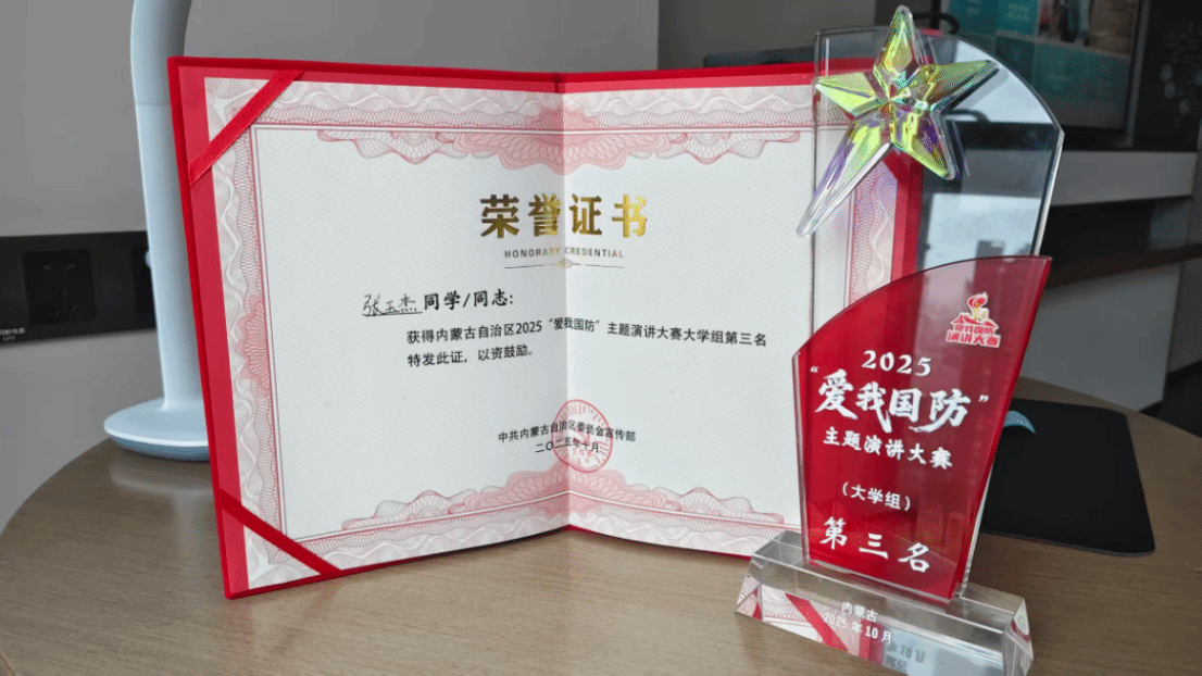 10月24日,2025年内蒙古自治区“爱我国防”主题演讲大赛决赛在内蒙古大学南校区桃李大讲堂圆满落幕。本次大赛由中共内蒙古自治区委员会宣传部、中共内蒙古自治区直属机关工作委员会、内蒙古自治区教育厅、内蒙古军区政治工作局共同主办,中央广播电视总台央广网内蒙古频道承办,内蒙古大学协办。我院车辆工程系汽车电子技术专业张玉杰同学凭借出色表现脱颖而出,荣获大赛第三名的优异成绩。