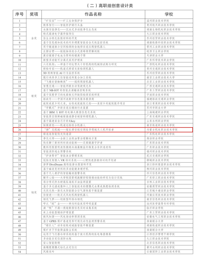 6月28日,第十七届“振兴杯”全国青年职业技能大赛(学生组)创新创效专项赛决赛获奖名单公布,由我院李蓉娟、李竟达等老师指导,张金帅、武鹏、谷青鹏、赵威、刘宝财、王凡赫等学生完成的作品《“御”见机域-超长滞空航空测绘多领域无人机开拓者》荣获高职组创意设计类银奖。