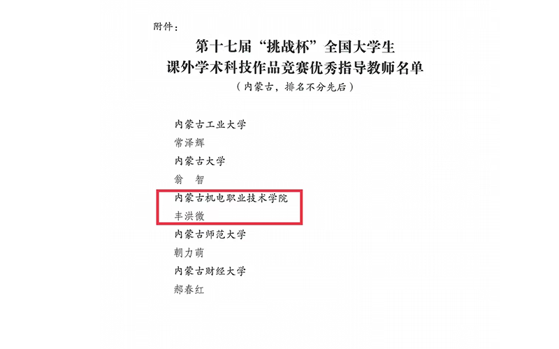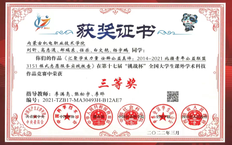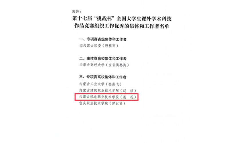 我院荣获第十七届“挑战杯”全国大学生课外学术科技作品竞赛专项赛组织工作优秀集体称号,莲花老师被授予第十七届“挑战杯”全国大学生课外学术科技作品竞赛专项赛组织工作优秀工作者荣誉称号,我院丰洪微老师被授予第十七届“挑战杯”全国大学生课外学术科技作品竞赛优秀指导教师荣誉称号。《汇聚学生力量 诠释公益真谛:2021-2021北疆青年公益联盟3151模式志愿服务实践报告》作品荣获三等奖。