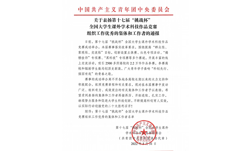 由共青团中央、中国科协、教育部、中国社会科学院、全国学联共同主办,四川大学承办的第十七届“挑战杯”全国大学生课外学术科技作品竞赛终审决赛圆满落幕。我院获得组织工作优秀集体称号、组织工作优秀工作者1名、优秀指导教师1名、三等奖1项。