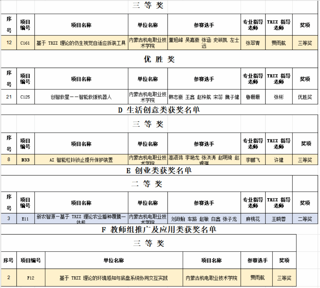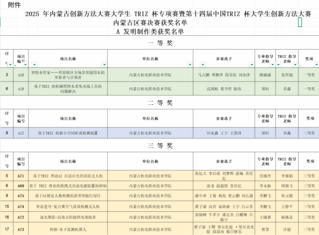 近日,2025年内蒙古创新方法大赛大学生TRIZ杯专项赛暨第十四届中国TRIZ杯大学生创新方法大赛获奖名单正式公布。学院参赛团队表现优异,一举斩获一等奖5项、二等奖4项、三等奖10项、优胜奖5项,学院获评优秀组织奖。