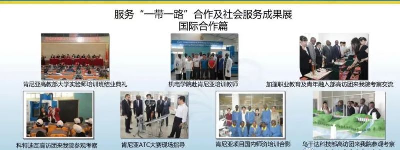 支持非洲职业教育发展,服务国家“一带一路”倡议。学院自2010年开始,与中航国际合作开展非洲职业教育建设项目。在非洲成立了“东非职业教育联合培训基地”,为肯尼亚、加纳等非洲国家提供师资培训、技术支持与服务。创办“ATC非洲职业技能挑战赛”,连续五届组织非洲地区职业技能挑战赛(ATC),创建“搭建平台、输出标准、创立大赛”的国际合作模式,为“走出去”的中国企业培养了大批高素质技术技能人才。