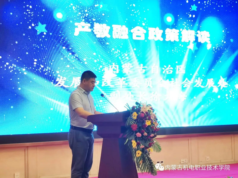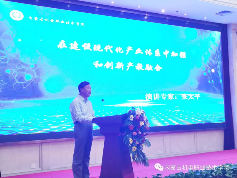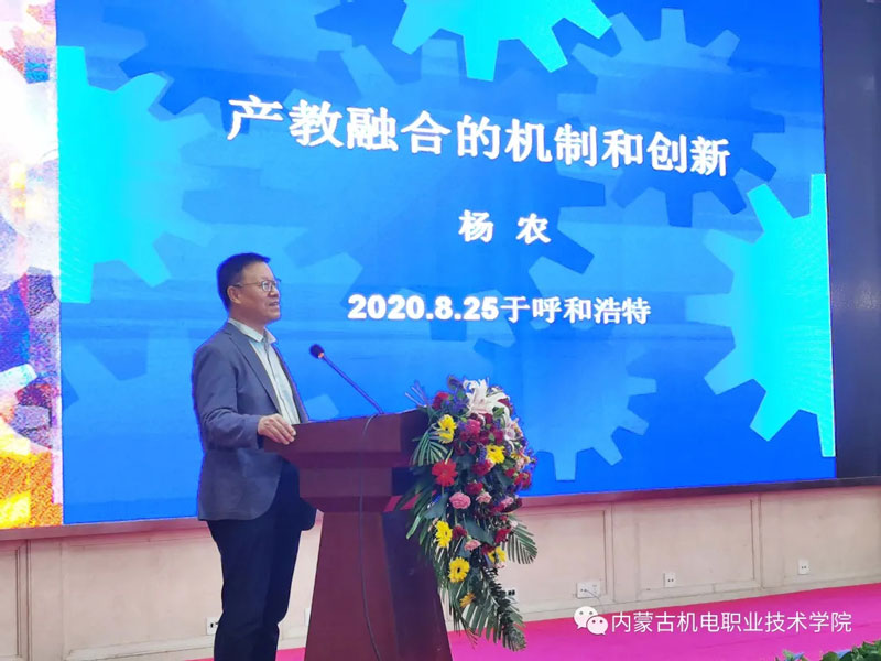 内蒙古自治区发展和改革委员会社会发展处副处长徐大海对产教融合政策进行了深入解读和介绍;郝俊副院长做了“双高计划背景下的校企命运共同体”主旨报告;特邀专家中华职业教育社党组成员、副总干事,杭州市“钱江特聘专家”人才,北京师范大学珠海分校特聘教授杨农、内蒙古经济学会会长张太平分别做了《产教融合的机制和创新》、《在建设现代化产业体系中加强和创新产教融合》的主题演讲;企业代表江苏汇博机器人技术有限公司战略与产品总监李子方、内蒙古嘉立铭节水科技集团总经理高铄分别就《产教融合—共筑职业院校与行业企业命运共同体》、《产教融合助推5G+智慧农业节水灌溉高效推广》进行了分享。