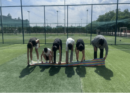 我院学生工作处大学生心理健康发展中心于5月27日在小足球场举办了团体辅导——蚂蚁翻树叶。“蚂蚁翻树叶”是一项团队心理游戏。同学们站在“树叶”上,通过协作将其翻面,全程不能接触地面。此活动提升了团队凝聚力与沟通能力,培养团队合作精神。增强了我院大学生勇敢面对挫折、建立乐观心态的心理健康意识。