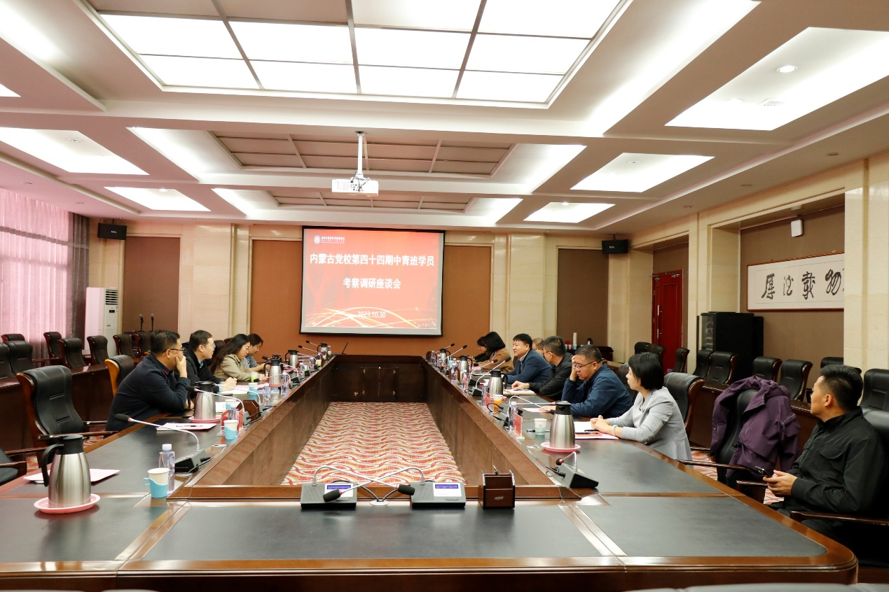 按照内蒙古党校学习计划安排,10月30日上午,自治区党校第四十四期中青班人才工作研究工作组一行9人,到高职园区4所院校开展工作调研,并在学院召开人才引进及相关政策落实情况调研座谈会;内蒙古化工职业学院、内蒙古电子信息职业技术学院、内蒙古商贸职业学院和我院相关部门负责人参加座谈会。