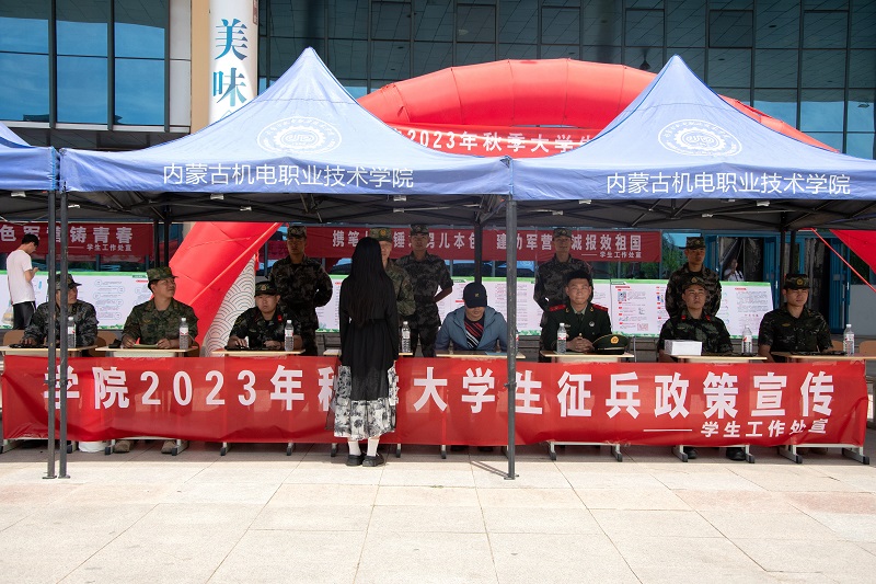 为深化国防教育工作、进一步增强学生国防观念,贯彻落实国家征兵政策、鼓励和引导大学生应征入伍,我院积极响应赛罕区武装部号召,于6月8日、9日中午在学院餐厅前广场开展了2023年度秋季征兵政策宣传活动。