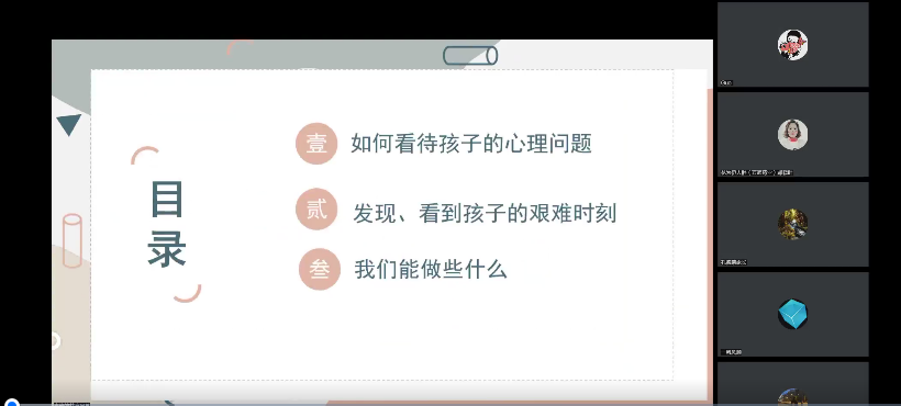 每个孩子都有可能遇到心理问题,那我们应该如何去看待孩子的心理问题。我们怎么能够发现孩子是否处于艰难的时刻,那如果我们的孩子有这样的一个艰难的时刻呢?我们能做些什么?李静老师以校园中真实案例为切入,围绕以上三个问题作了详细阐述,从专业的角度和家长们介绍了孩子处于各个阶段的心理特点、心理发展需要、可能出现的心理危机,并结合案例将相关理论知识和处理方法讲解得生动易懂。作为家长,一方面要认识到孩子心理发展的阶段性,尊重孩子的自我意识;另一方面要经营好自己的生活,加强学习,与时俱进,找到自己的归属感与价值感,同时也要学会正确地表达爱,适时以共情、一致型的方式与孩子沟通,给予孩子充分的理解和关怀,做彼此最坚强的后盾。最后,李静老师就家长们提出的问题做了解答,为家长们提供了解决问题的思路和办法,获得了家长们的广泛好评。
