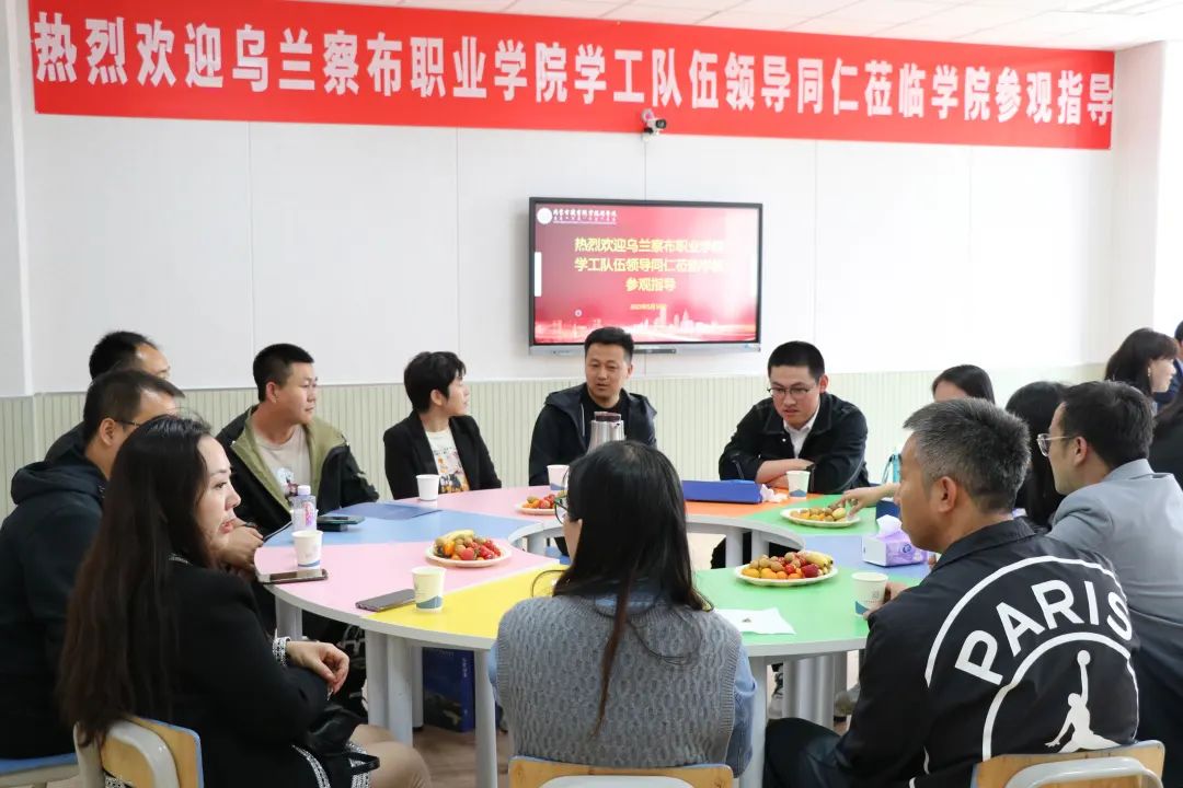 座谈会后,乌兰察布职业学院学工队伍一行人员参观了我院校史馆、“一站式”学生社区、大学生心理健康发展中心、“培根铸魂”党团和班级建设辅导员工作室、“心灵充电站”辅导员工作室、素质拓展基地。参观结束后,双方就学生工作进行了深入交流。