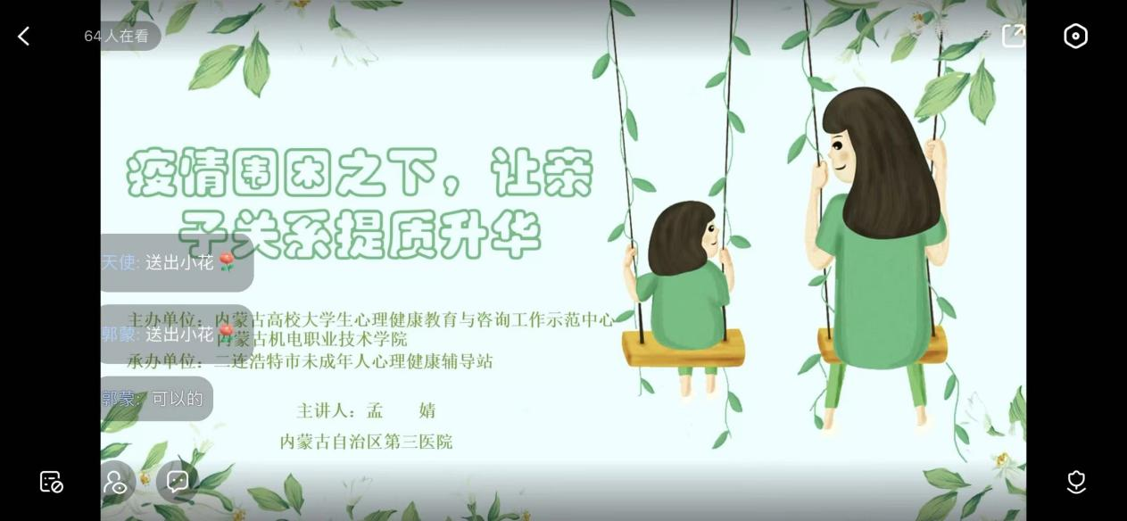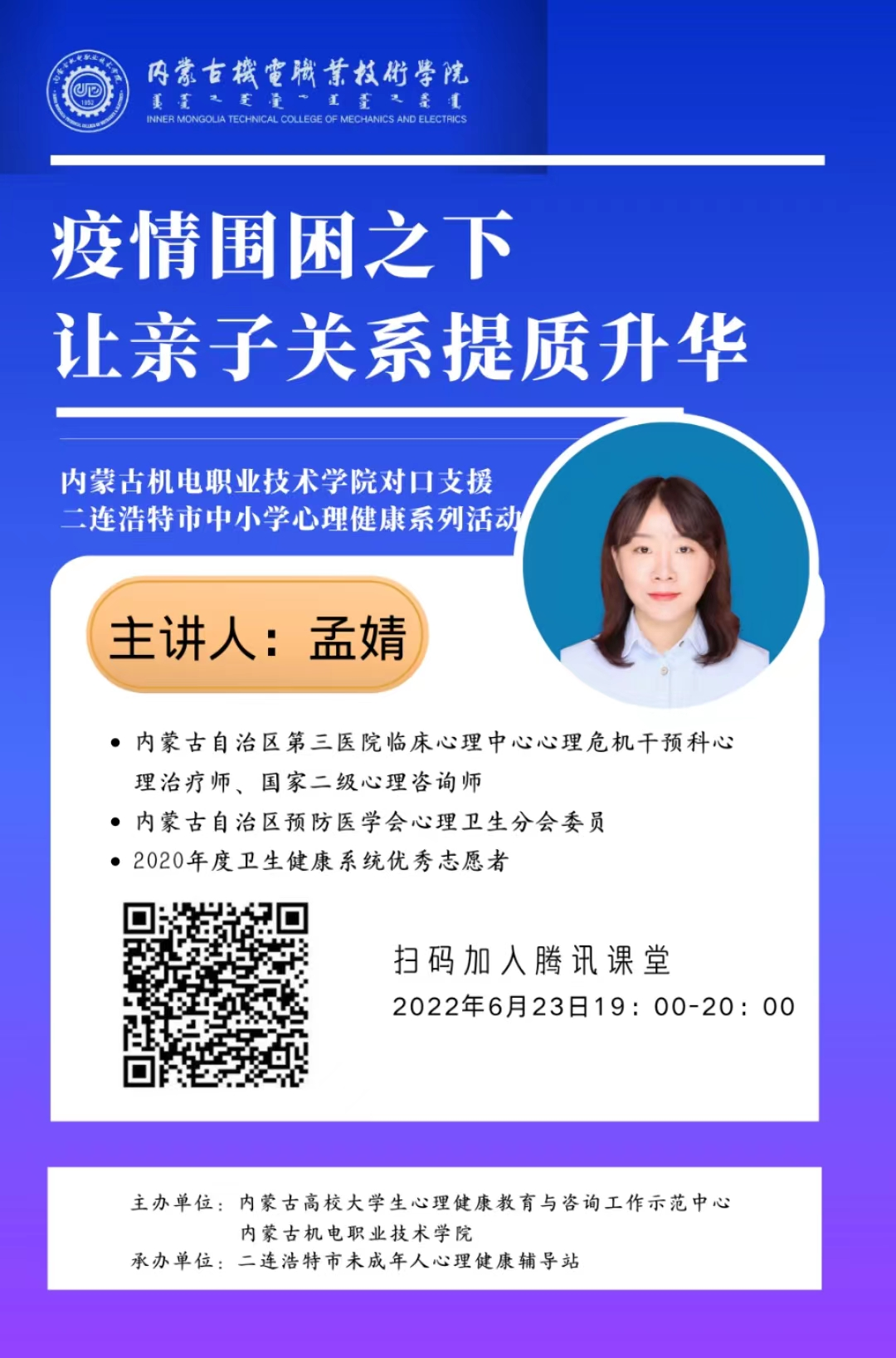 面对二连浩特市反复的疫情状况,为贯彻落实自治区教育厅《关于全区大学生心理健康教育示范中心对口支援中小学心理健康教育的通知》文件精神,切实发挥心理健康教育示范中心引领、辐射、带动和指导的作用。我院大学生心理健康发展中心特邀请内蒙古自治区第三医院临床心理中心心理危机干预科心理治疗师、国家二级心理咨询师、内蒙古自治区预防医学会心理卫生分会委员孟婧咨询师于2022年6月25日晚对二连浩特市中小学生家长开展题为《疫情围困之下,让亲子关系提质升华》专题讲座,对口支援活动得到二连浩特市未成年人心理健康辅导站的大力支持。二连浩特市中小学生家长通过直播和回看的方式聆听了此次培训。
