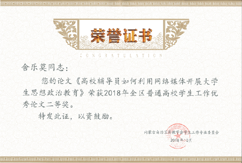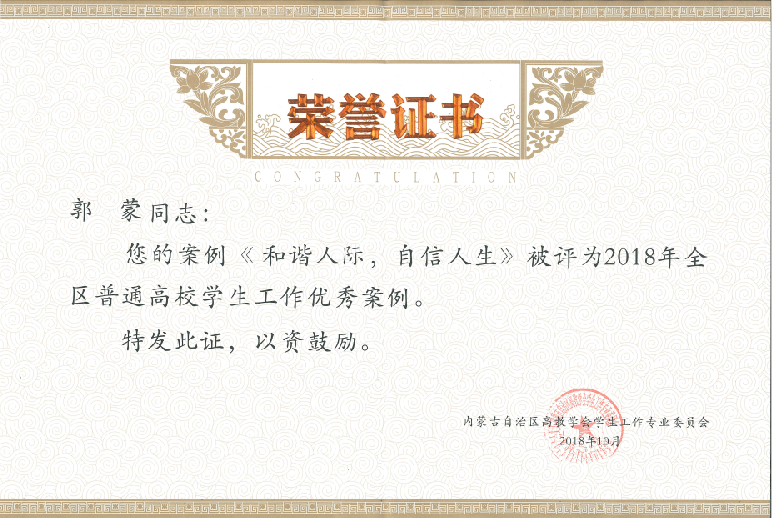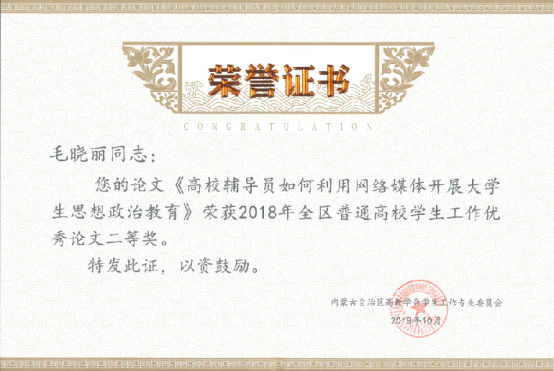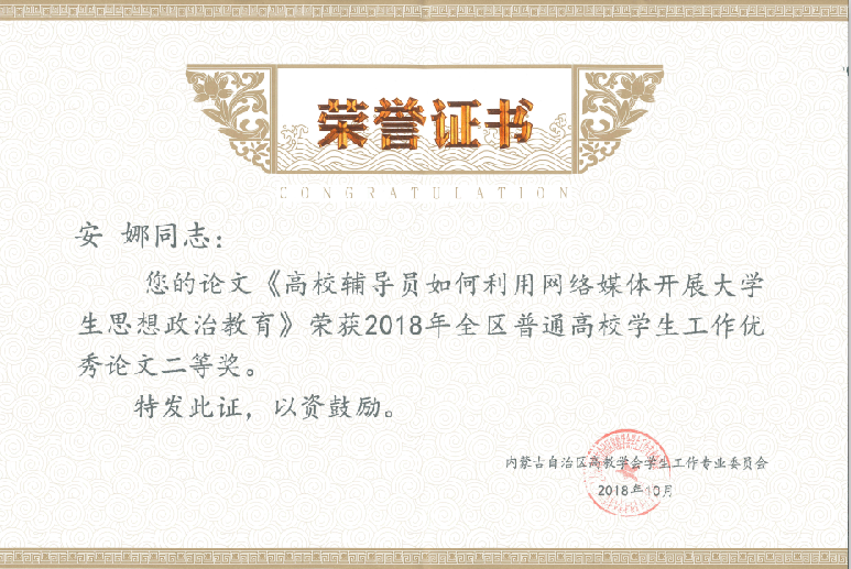内蒙古自治区高教学会学生工作专业委员开展了2018年度学术论文和学生工作典型案例征集活动,征集思政论文145篇,工作案例117篇,经专家评审,评出优秀论文39篇,其中一等奖5篇,二等奖7篇,三等奖10篇,优秀奖17篇,优秀工作案例10篇。我院辅导员安娜、舍乐莫、毛晓丽提交的论文《高校辅导员如何利用网络媒体开展大学生思想政治教育》获得优秀论文二等奖;郭蒙提交的工作案例《和谐人际,自信人生》获得学生工作案例优秀奖。