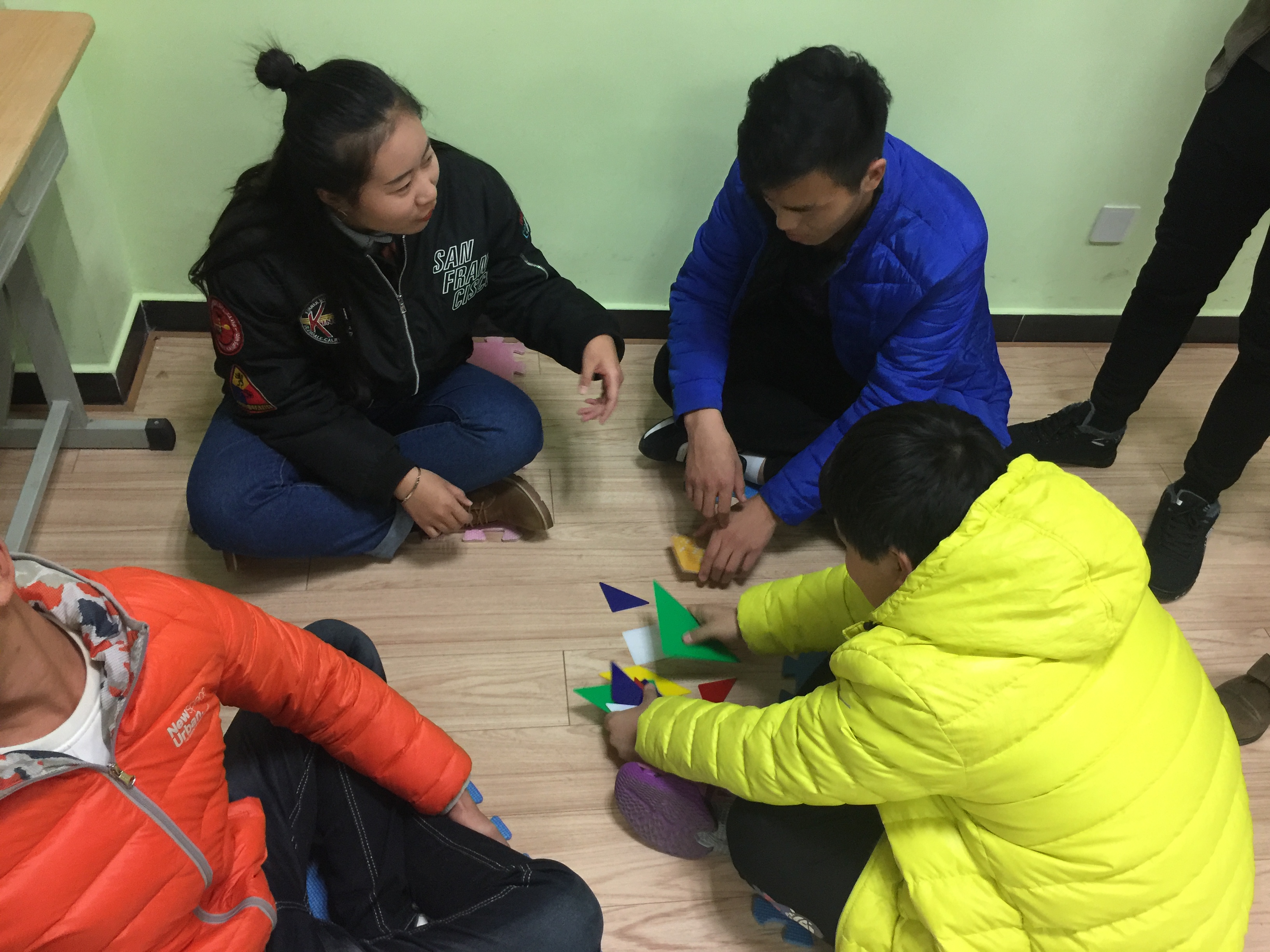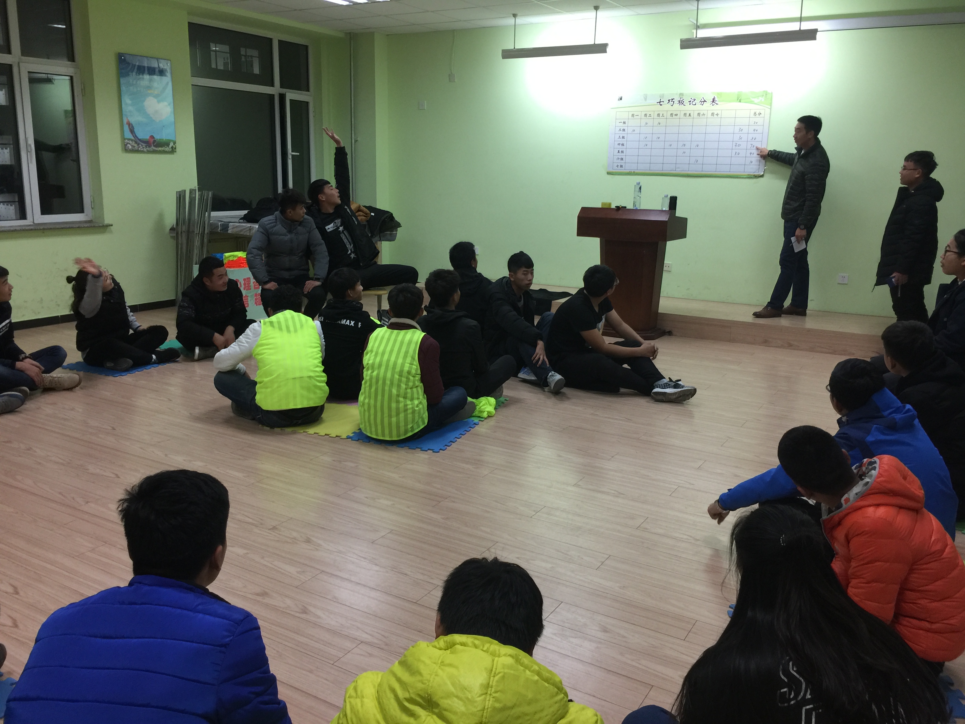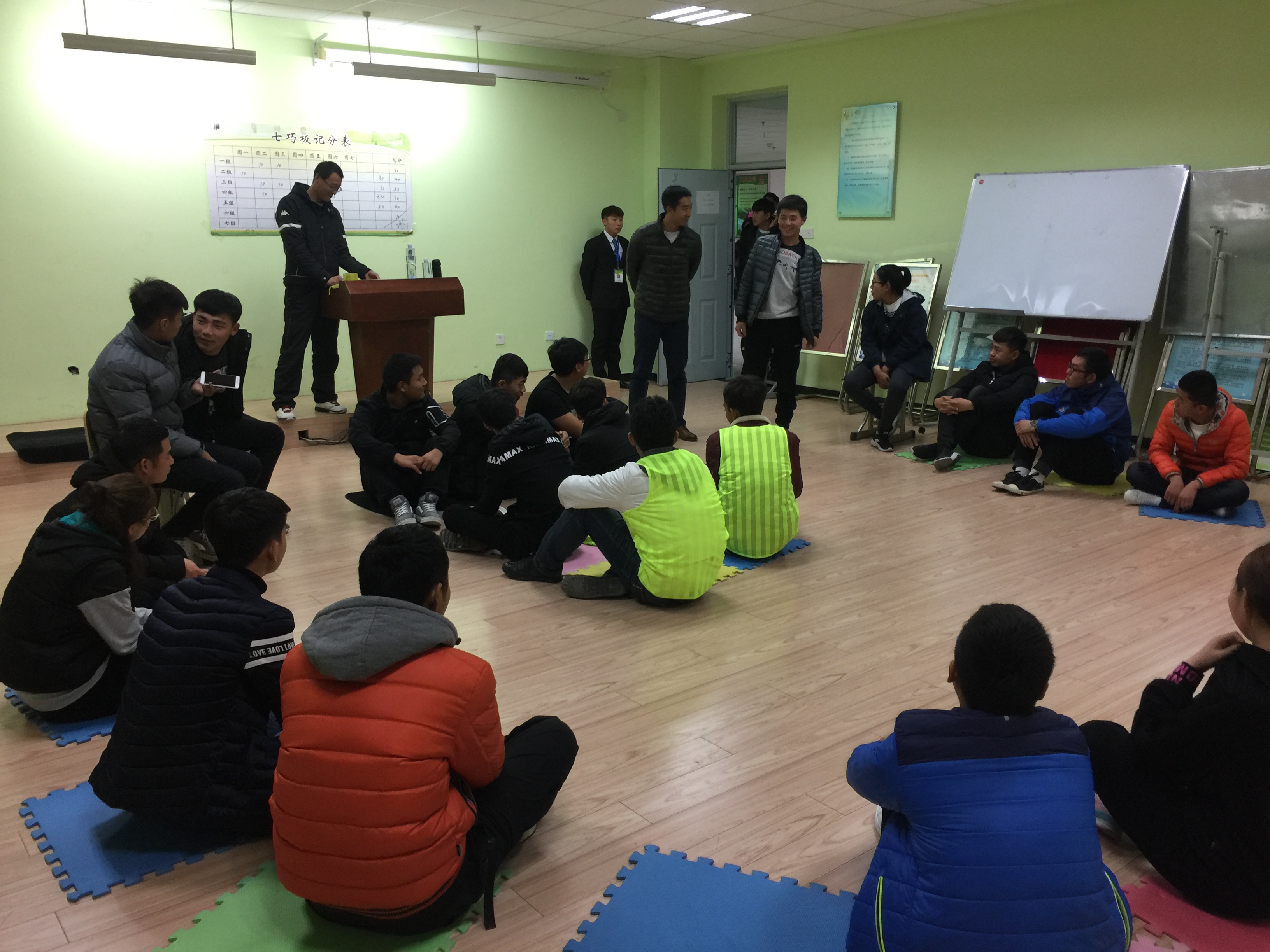 为保障团体心理辅导的趣味性和安全性,该活动负责人青松老师、李玮光老师将参与人员分为两组,分别带队,并依次进行了“新奇介绍”、“七巧板”、“盗梦空间”三个活动项目。活动期间,各小组成员积极参与,队员合作密切,配合默契,在摸索中很快掌握取胜技巧。活动过程中充满了欢声笑语,处处可以感受到团队合作的力量。