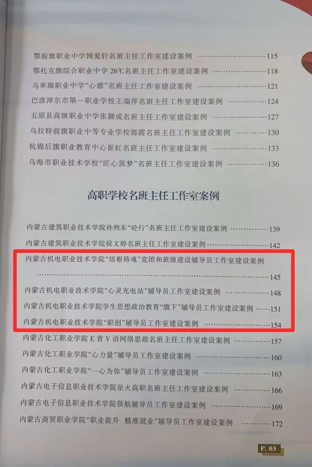 近日,内蒙古自治区教育厅从已建成的全区各职业学校班主任工作室中遴选了一批典型案例并汇编成《内蒙古自治区职业学校名班主任工作室案例集》,我院4个辅导员工作室案例成功入选。