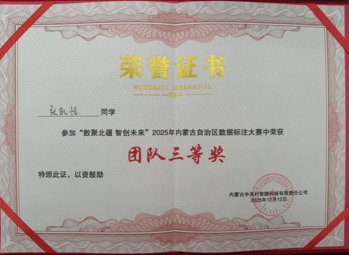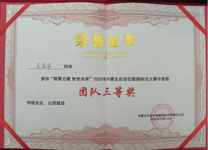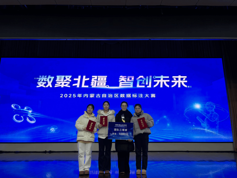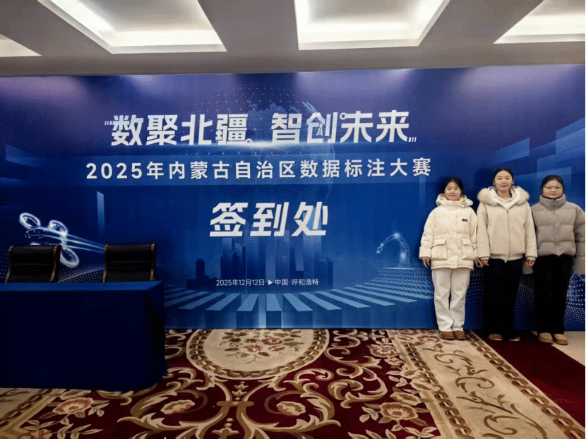 2025年12月12日,内蒙古自治区“数聚北疆,智创未来”数据标注大赛圆满落幕。内蒙古机电职业技术学院信息工程系学子张凯悦、王庆华、高涛组成的参赛团队,在裴栋、杨舒两位老师的悉心指导下,凭借扎实的专业技能与高效的团队协作,从众多参赛队伍中脱颖而出,成功斩获团队三等奖。