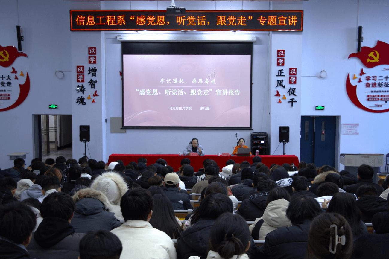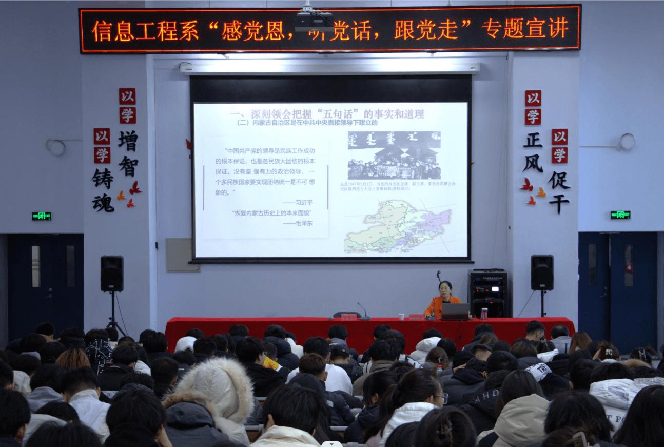 为持续深入学习贯彻习近平总书记对内蒙古的重要指示批示精神,抓好《国务院关于推动内蒙古高质量发展奋力书写中国式现代化新篇章的意见》(以下简称《意见》)精神的贯彻落实,紧跟学院党委“感党恩、听党话、跟党走”自治区宣讲团报告会指示精神,12月7日下午,信息工程系党总支理论中心组召开“感党恩、听党话、跟党走”主题宣讲活动,系党总支班子成员出席,系部全体教师学生共同参加活动。报告会由系党总支副书记舍乐莫主持。