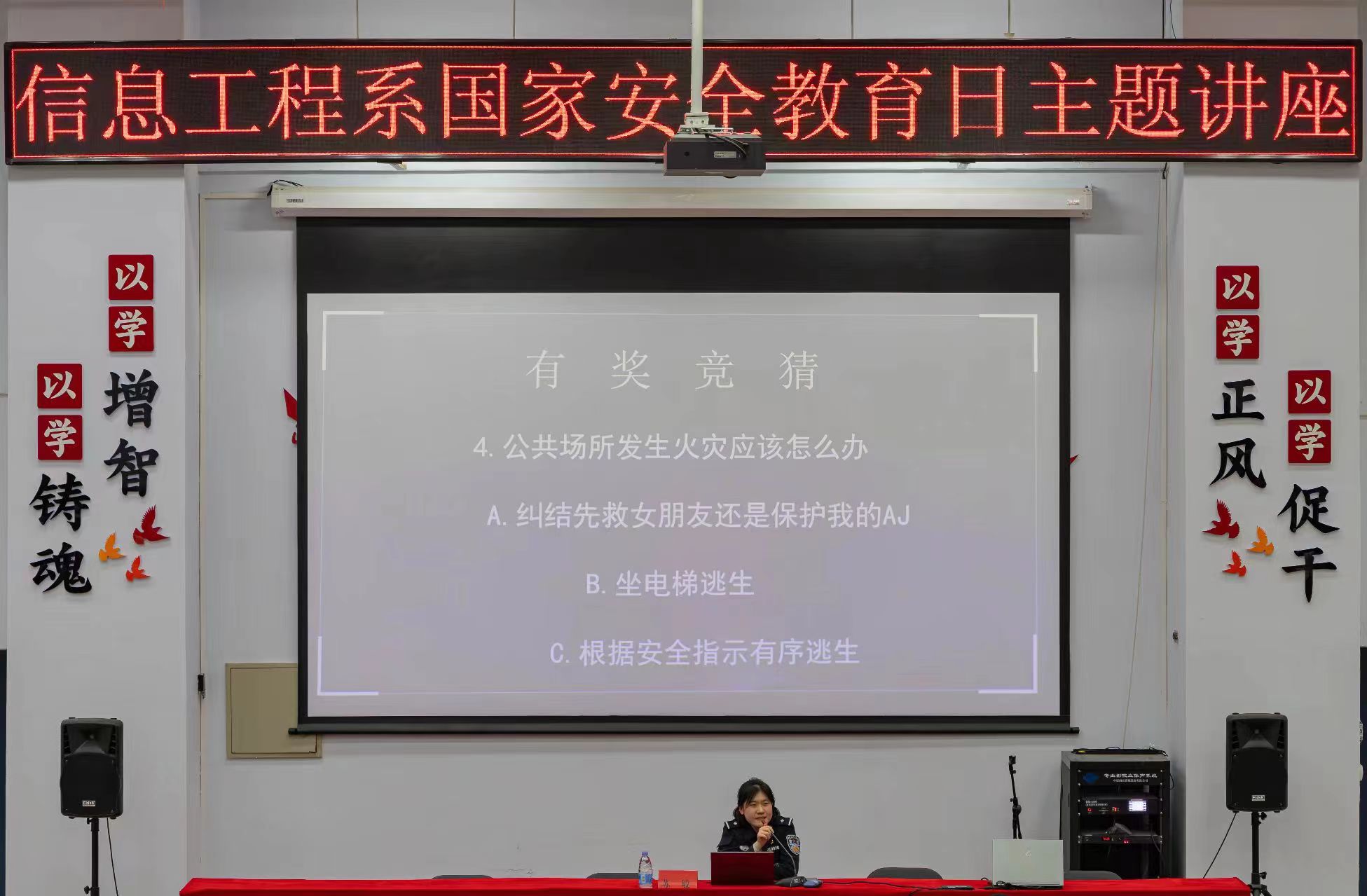 随后,苏敏警官用通俗易懂的语言,结合丰富的案例宣传片、短视频告诉大家随手拍发的照片、朋友圈,都可能泄露国家机密,危害国家安全,向同学们讲解国家安全教育的重要性和紧迫性。通过互动答题的方式,给同学们普及了国家安全相关的法律法规和防范技能。