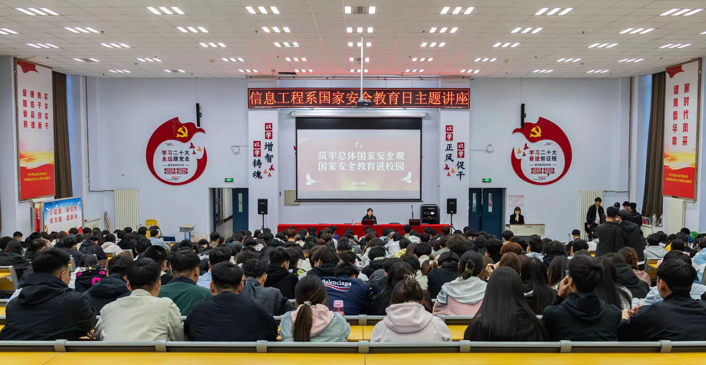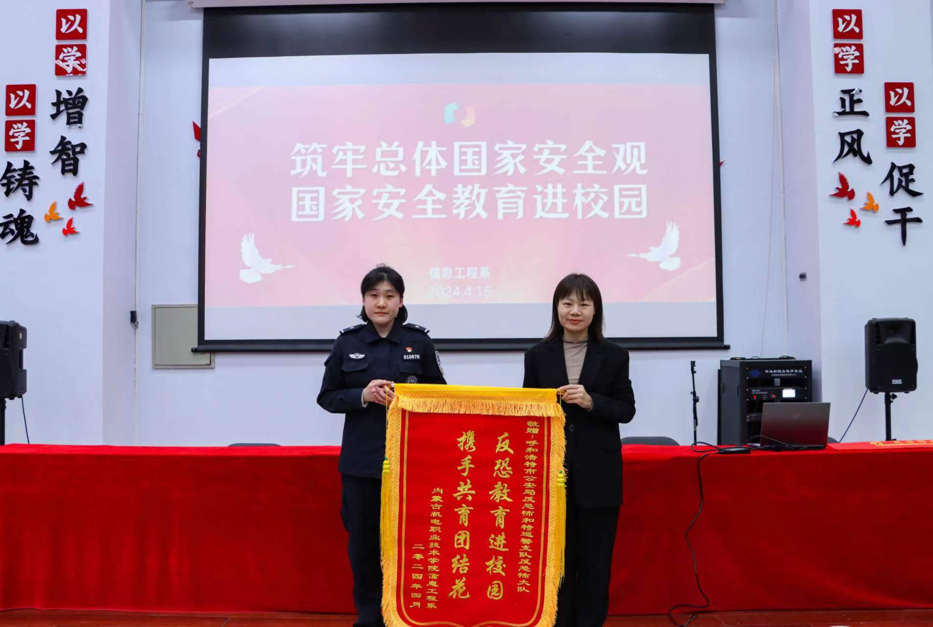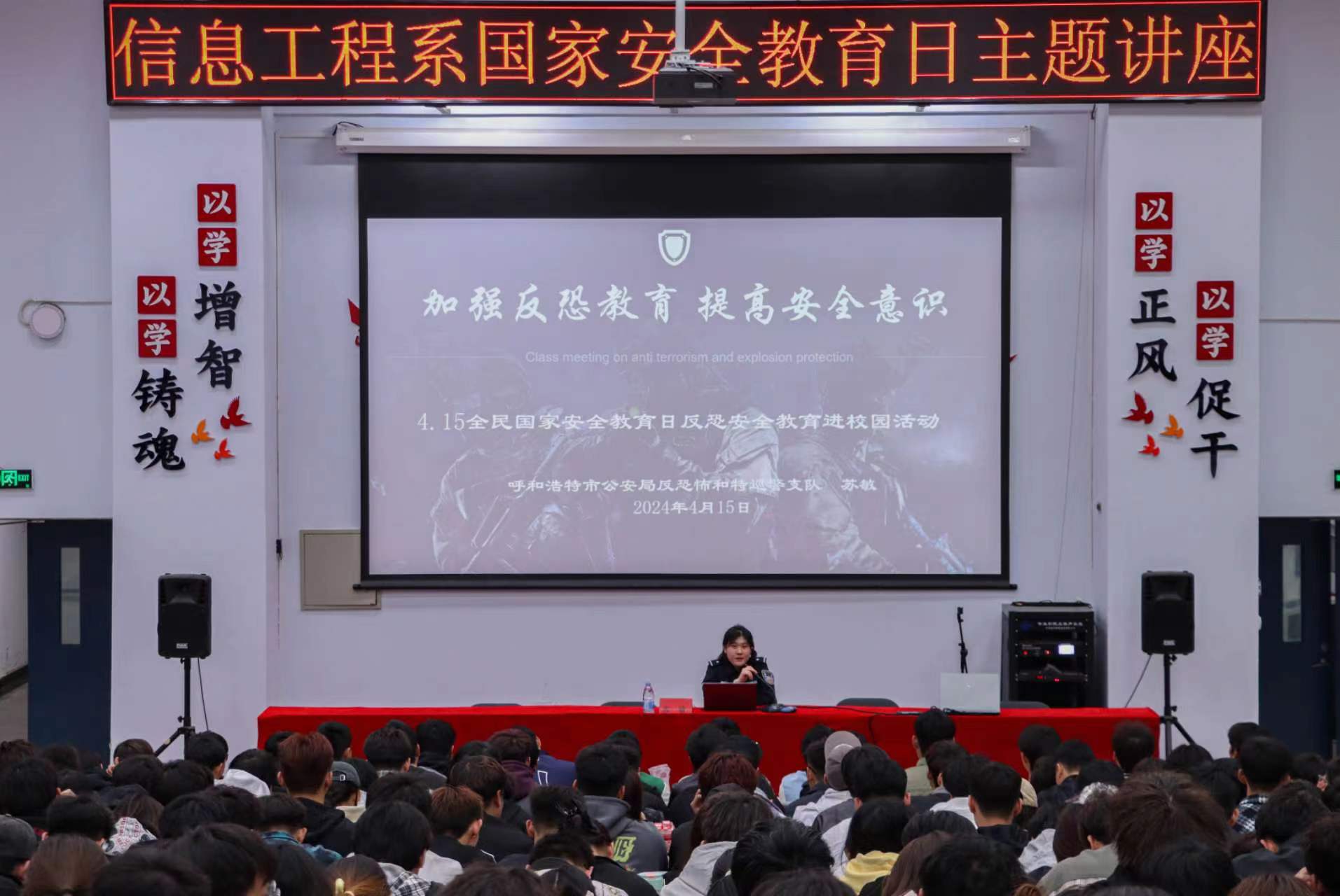 今年是习近平总书记提出总体国家安全观10周年,4月15日是我国第9个全民国家安全教育日,为深入学习贯彻习近平总书记关于全面加强国家安全教育的重要指示批示精神,提高学生国家安全意识和法治意识,为营造关注国家安全、了解国家安全、重视国家安全的良好氛围,进一步增强学生国家安全素养,信息工程系于2024年4月15日,在教学楼D109举办一场国家安全教育日主题讲座。呼和浩特市公安局反恐怖和特巡警支队反恐怖大队苏敏警官主讲,信息工程系学生代表聆听讲座,讲座由信息工程系团学办公室(含就业服务)副主任王雪莹主持。