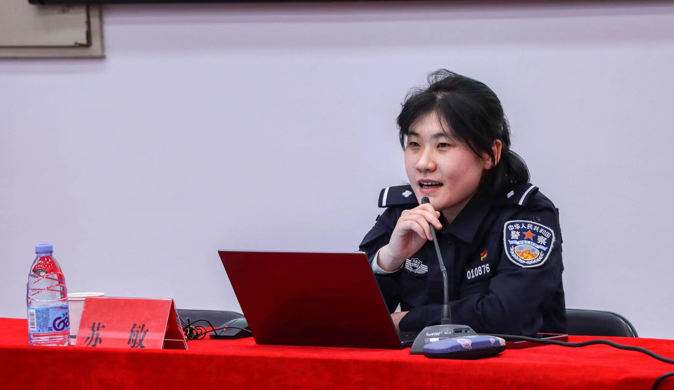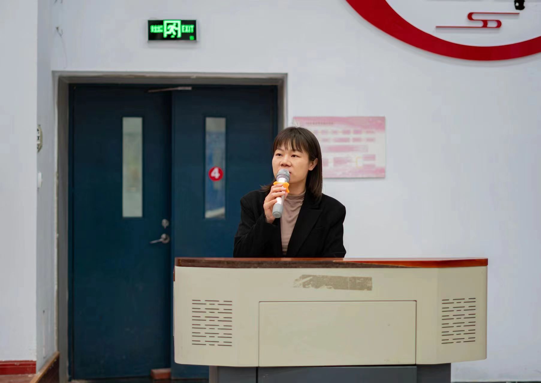 王雪莹首先代表信息工程系对苏敏等三位警官的到来表示热烈的欢迎,进而跟同学们强调国家安全教育的重要性,同时希望同学们能够珍惜这次难得的学习机会,深入了解国家安全知识,增强国家安全意识。