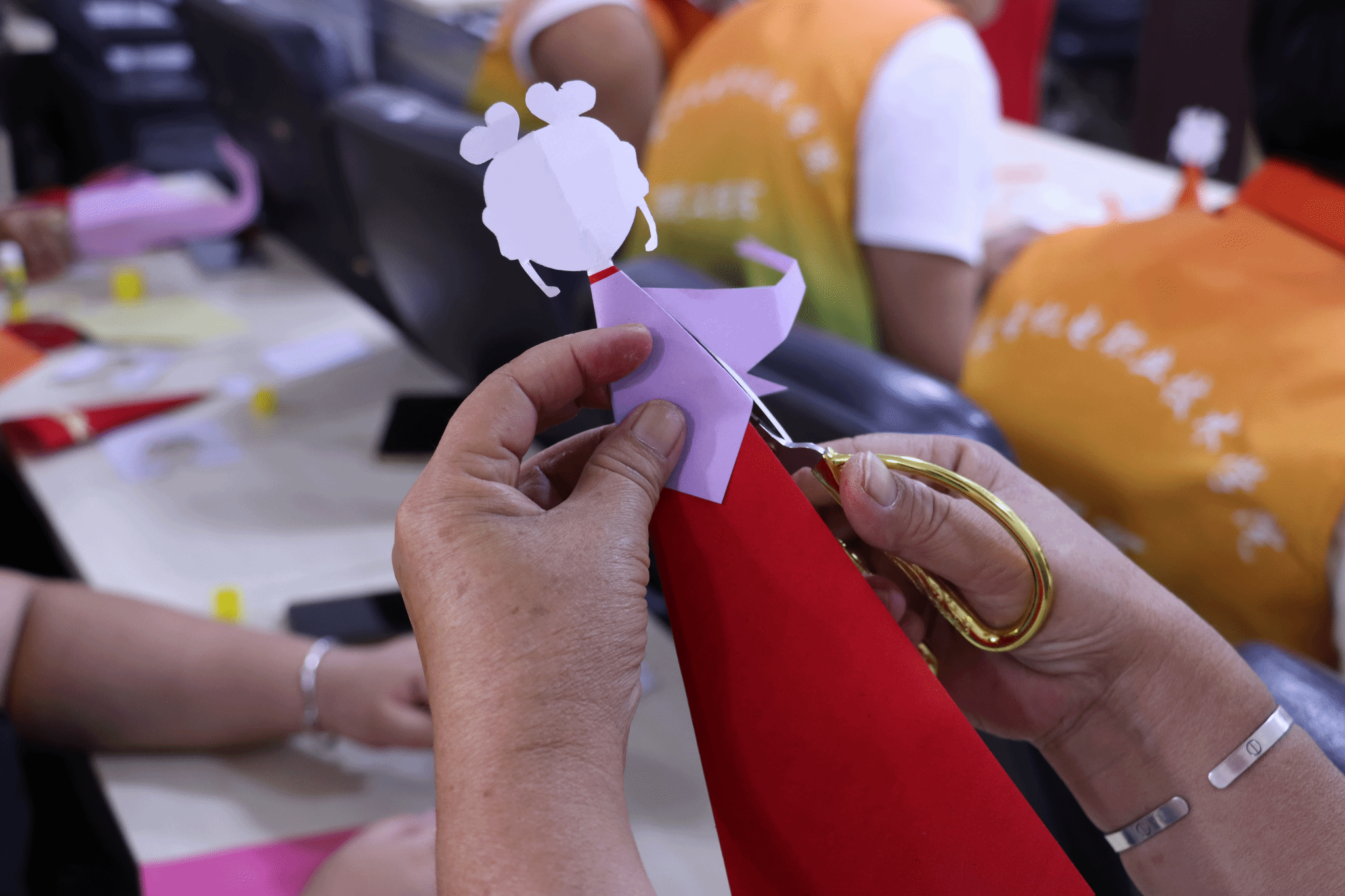 实践团第四站来到纳文慕仁社区哈尼卡传习所名家工作室,体验哈尼卡剪纸技艺。在“哈尼卡”传承人的指导下,学生们每人一把剪纸工具和彩纸,从理论到实践,亲自体验制作各具特色的哈尼卡纸偶。