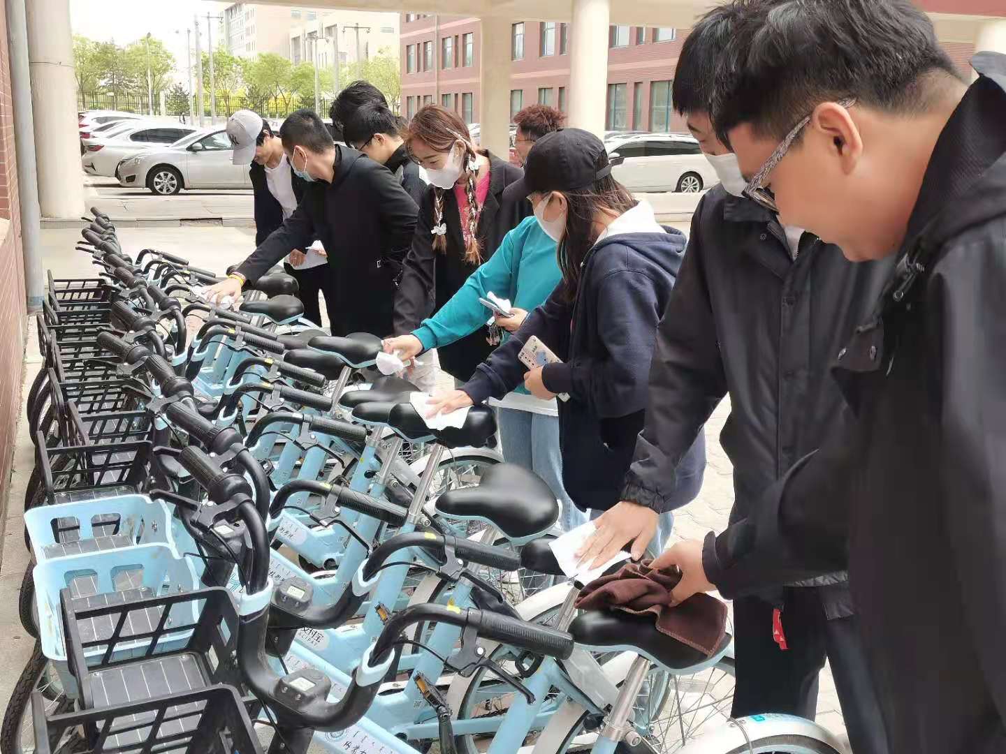 各专业班级的志愿者们来到各自负责区域,对区域内共享单车、烟头、垃圾等进行清洁以及对共享单车进行摆放,在这周每天1小时的志愿服务过程中,学院内各个共享单车停放区都变得焕然一新,单车整齐的摆放在停放区内,环境卫生得到显著改善。