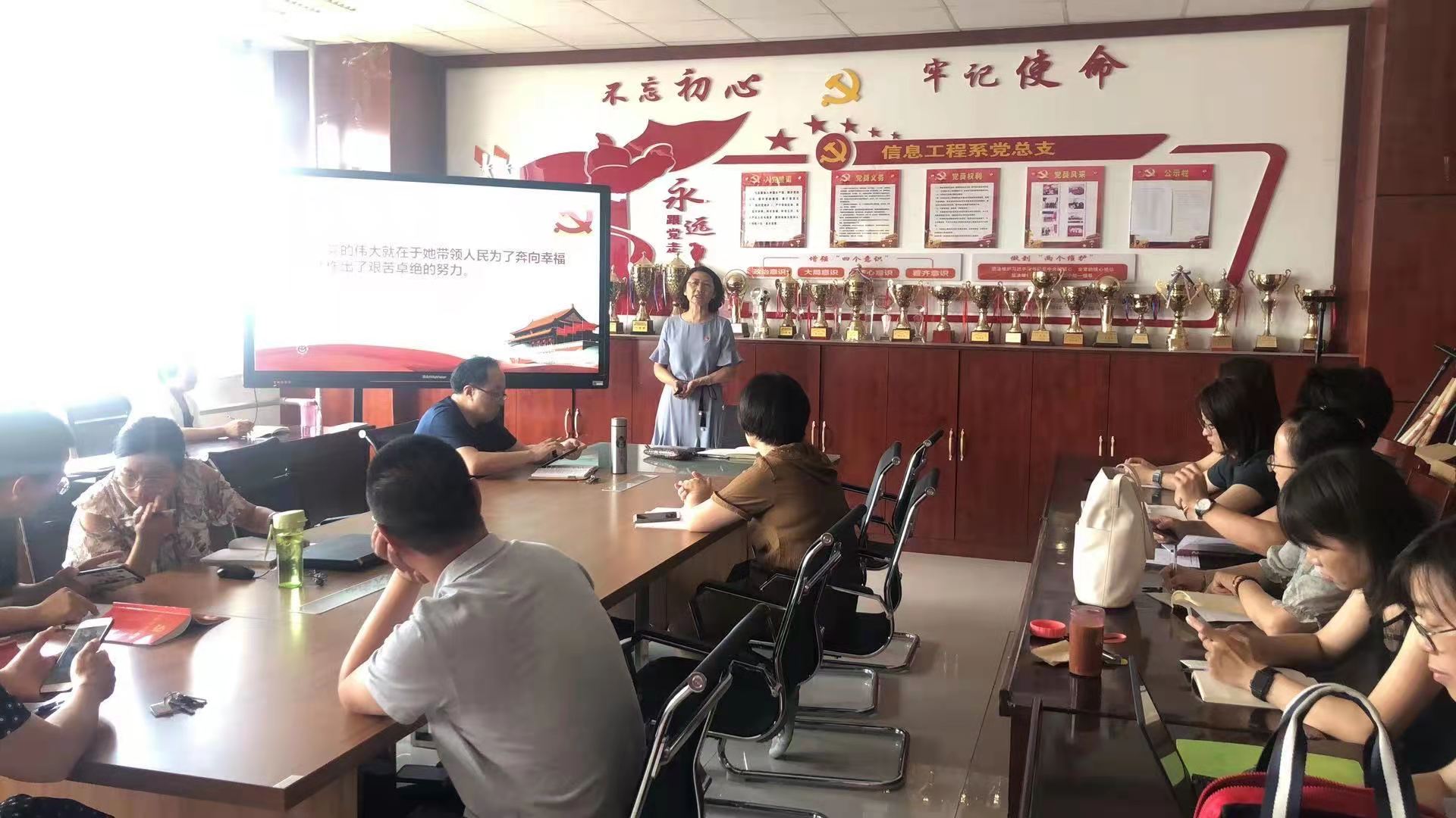 为深入贯彻落实习近平总书记在党史学习教育动员大会上的重要讲话精神,切实加强基层党建,提高党性修养,坚定理想信念,深刻领会中国力量,信息工程系党总支积极开展“”学党史、感党恩、跟党走”书记讲党课活动,共同学习百年党史,献礼建党百年。6月28日下午,党总支书记王熔熔在系会议室讲授“牢记党恩凝聚中国力量,坚定信念勇担强国使命”专题党课,信息工程系全体教职工参加会议。