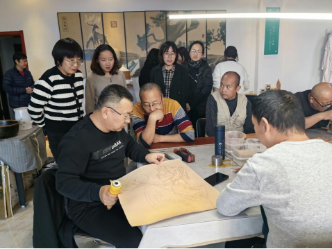 随后,在托养中心工作人员的引导下,党支部成员参观了孩子们的宿舍、厨房与特色课堂。走进宿舍,整洁的床铺、叠放整齐的衣物、墙上张贴的卡通装饰让人感受到家的温暖;厨房内,消毒柜、冰箱等设备齐全,食材储存规范有序;课堂上,皮画制作与戳羊毛两门特色课程正在有序开展,孩子们正专注地跟着老师学习制作皮画。另一间教室的戳羊毛课堂里,孩子们手持戳针,将蓬松羊毛一点点塑造成憨态可掬的动物造型。党员同志们驻足观看,不时为孩子们的创意与耐心点赞,还与授课老师深入交流特殊儿童手工教学的技巧与经验。